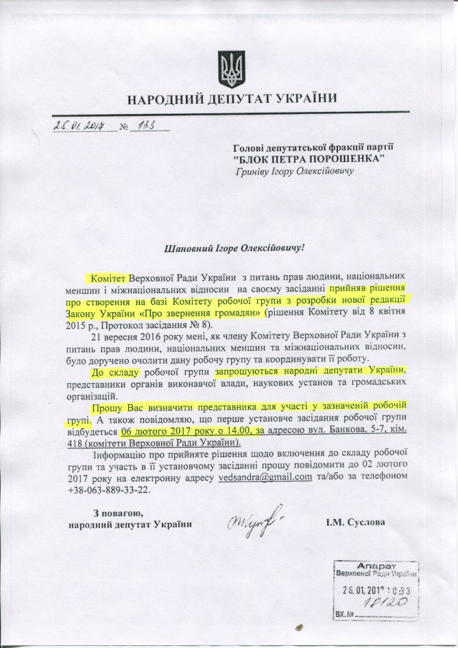 27Січ Коментування вимкнено Лист народного депутата України І.М. Суслової щодо створення робочої групи з розробки нової редакції Закону України “Про звернення громадян”