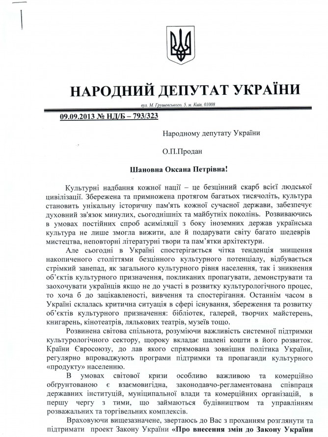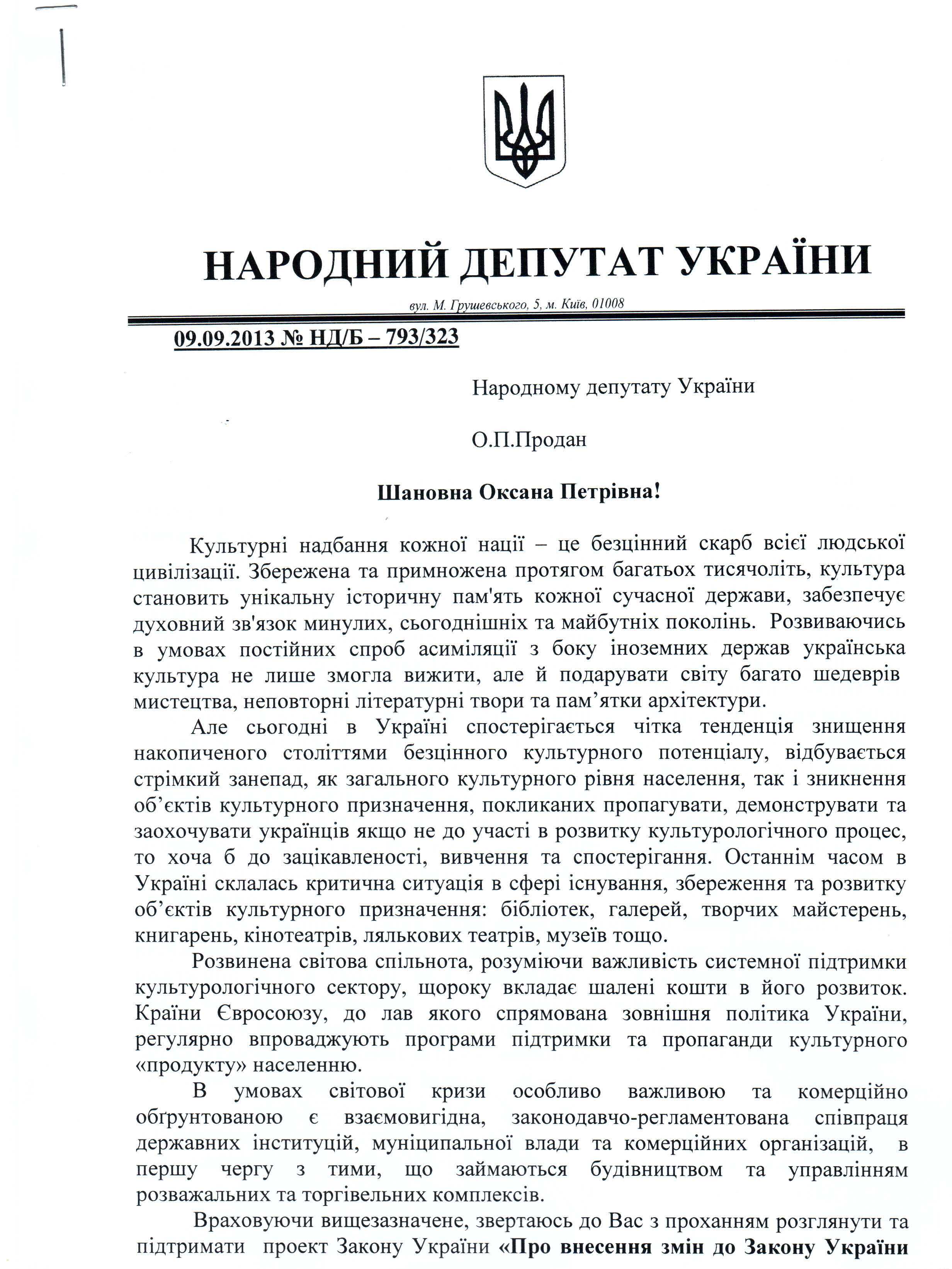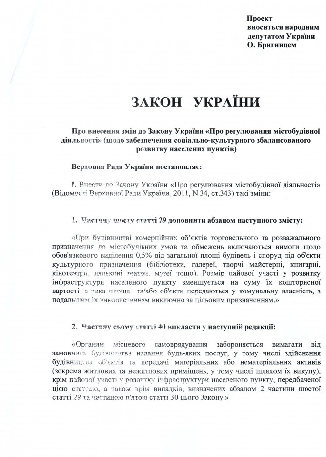 Головна > Верховна Рада України > Вхідна документація > Лист народного депутата України О. Бригинця з пропозицією підтримати проект Закону України “Про внесення змін до Закону України “Про регулювання містобудівної діяльності” (щодо забезпечення соціально-культурного збалансованого розвитку населених пунктів)