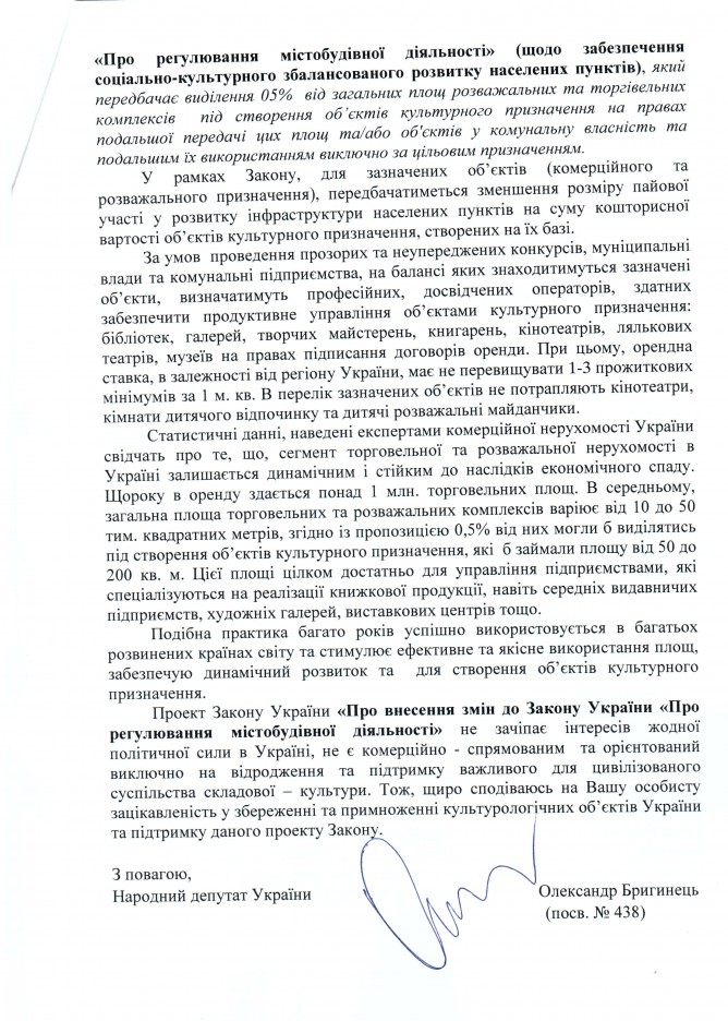 Лист народного депутата України О. Бригинця з пропозицією підтримати проект Закону України “Про внесення змін до Закону України “Про регулювання містобудівної діяльності” (щодо забезпечення соціально-культурного збалансованого розвитку населених пунктів)