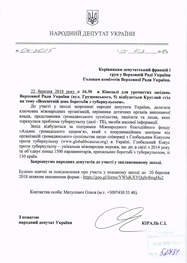 Головна > Верховна Рада України > Вхідна документація > Лист народного депутата України С.І. Кіраля щодо проведення круглого столу на тему: “Всесвітній день боротьби з туберкульозом”, 22 березня 2018 року