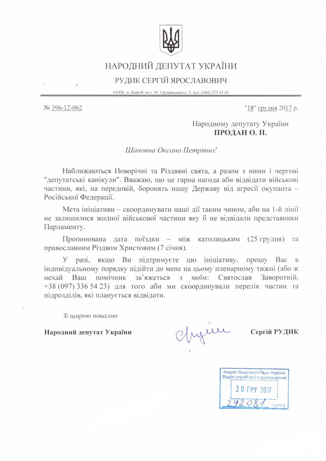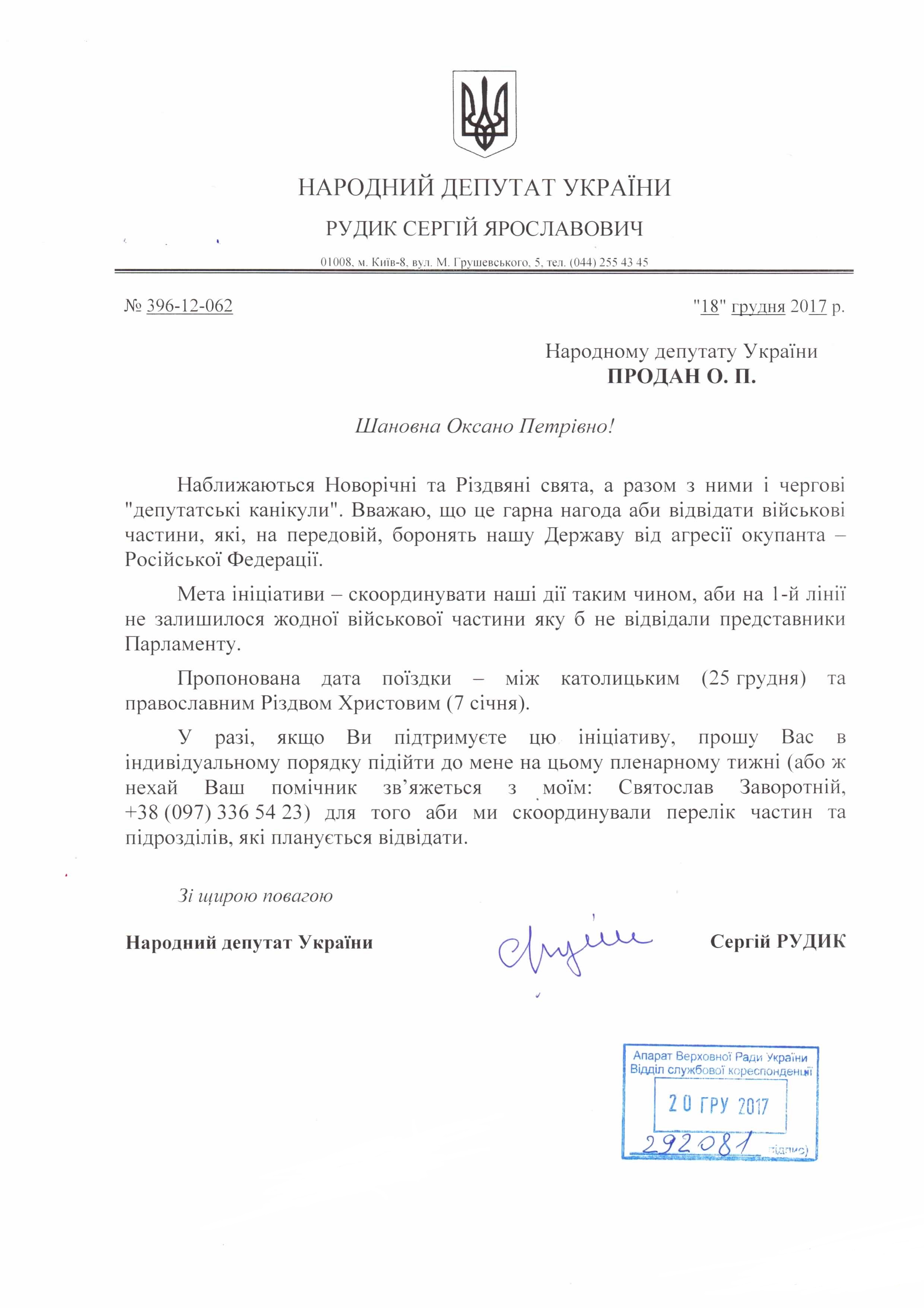 10Січ Коментування вимкнено Лист народного депутата України С.Я. Рудика щодо відвідування військових частин