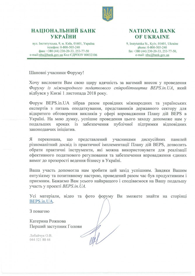 Лист Національного банку України з подякою за участь у Форумі із міжнародного податкового співробітництва BEPS.in.UA