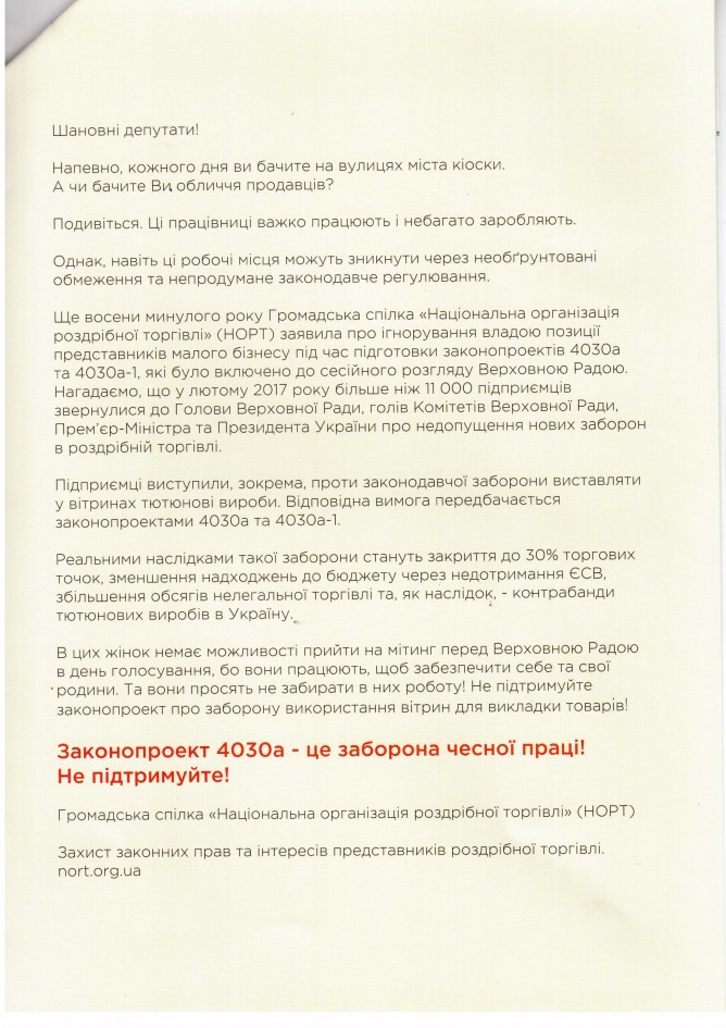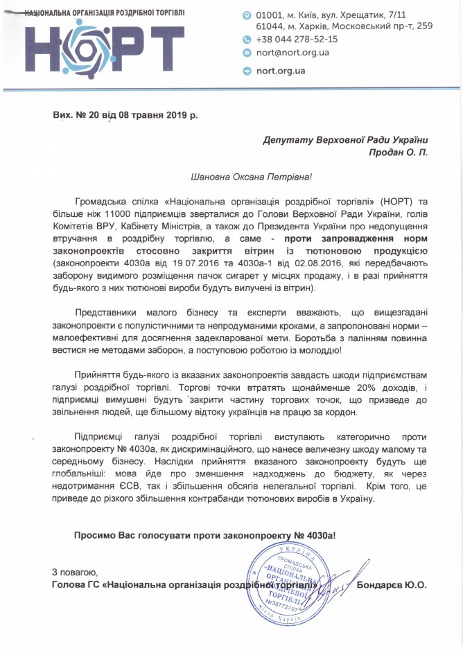 Вхідна документація > Лист Національної організації роздрібної торгівлі щодо недоцільності прийняття законопроекту “Про внесення змін до деяких законодавчих актів України (щодо захисту громадського здоров’я від шкідливого впливу тютюнового диму)”, реєстр. №4030а