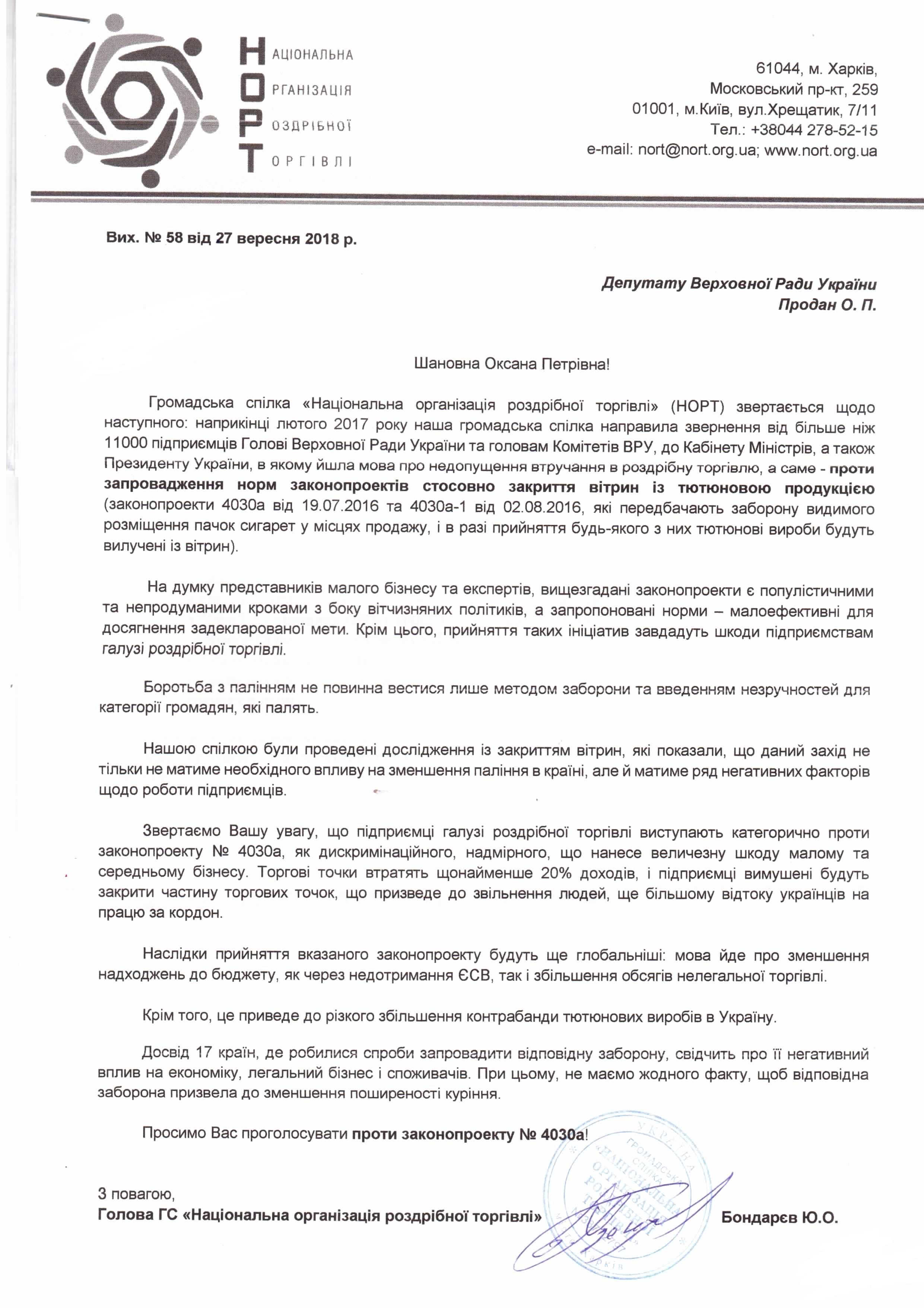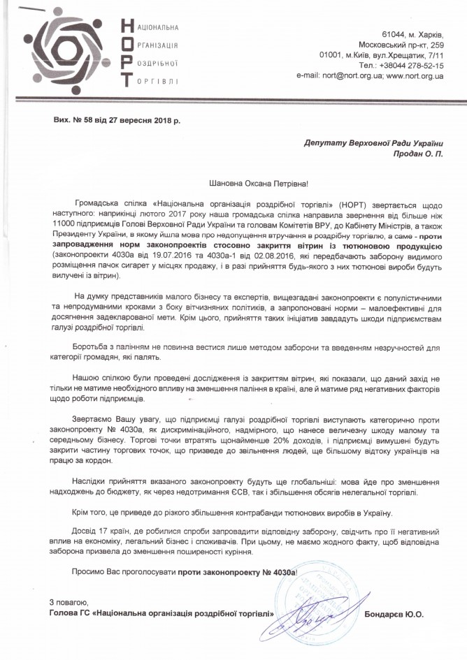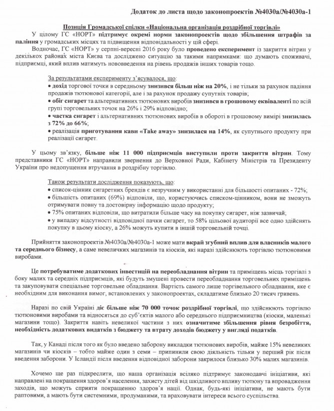 Головна > Верховна Рада України > Вхідна документація > Лист Національної організації роздрібної торгівлі щодо непідтримки законопроектів №4030а та 4030а-1, що стосуються закриття тварин із тютюновою продукцією