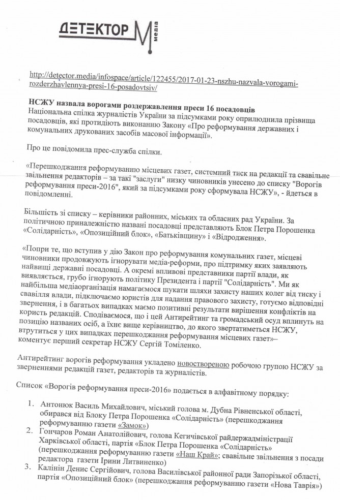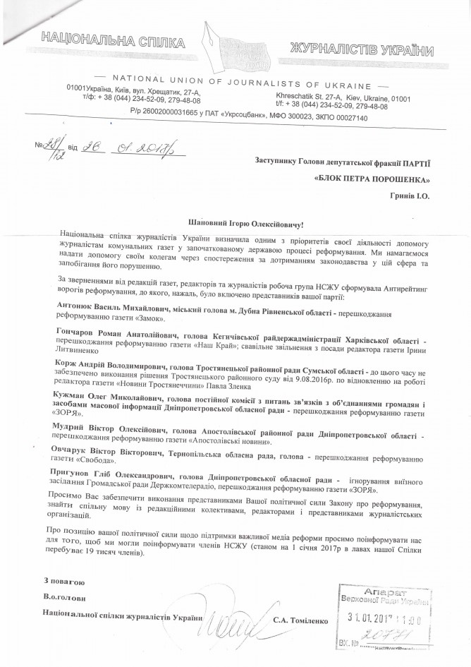 19Кві Коментування вимкнено Лист Національної спілки журналістів України щодо рейтингу осіб, які перешкоджають реформуванню комунальних газет