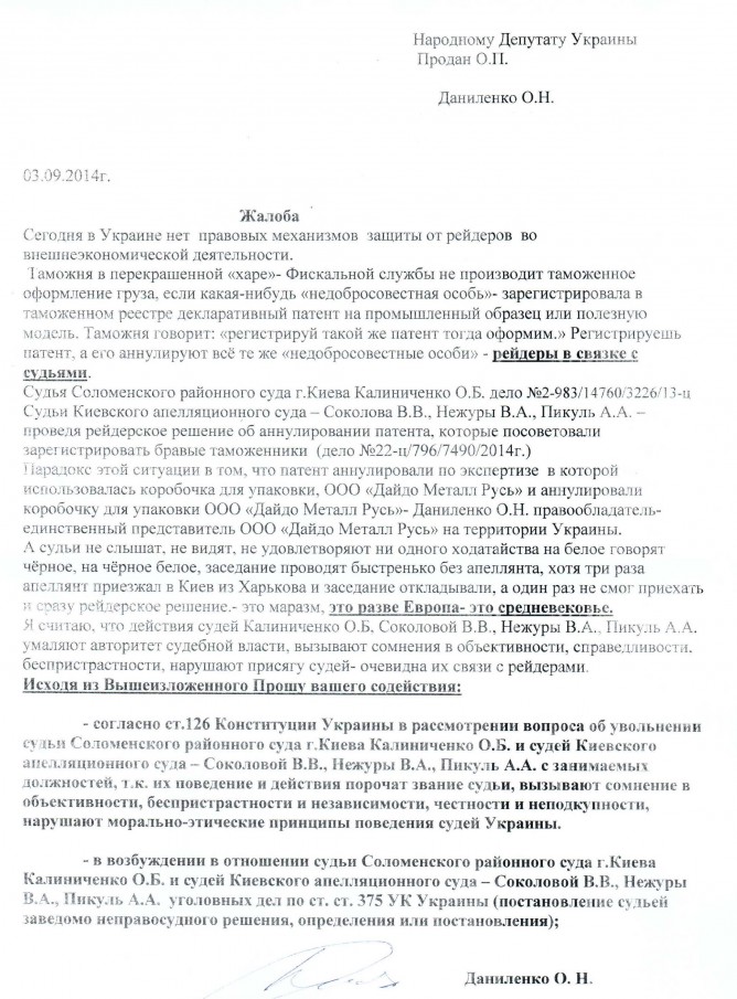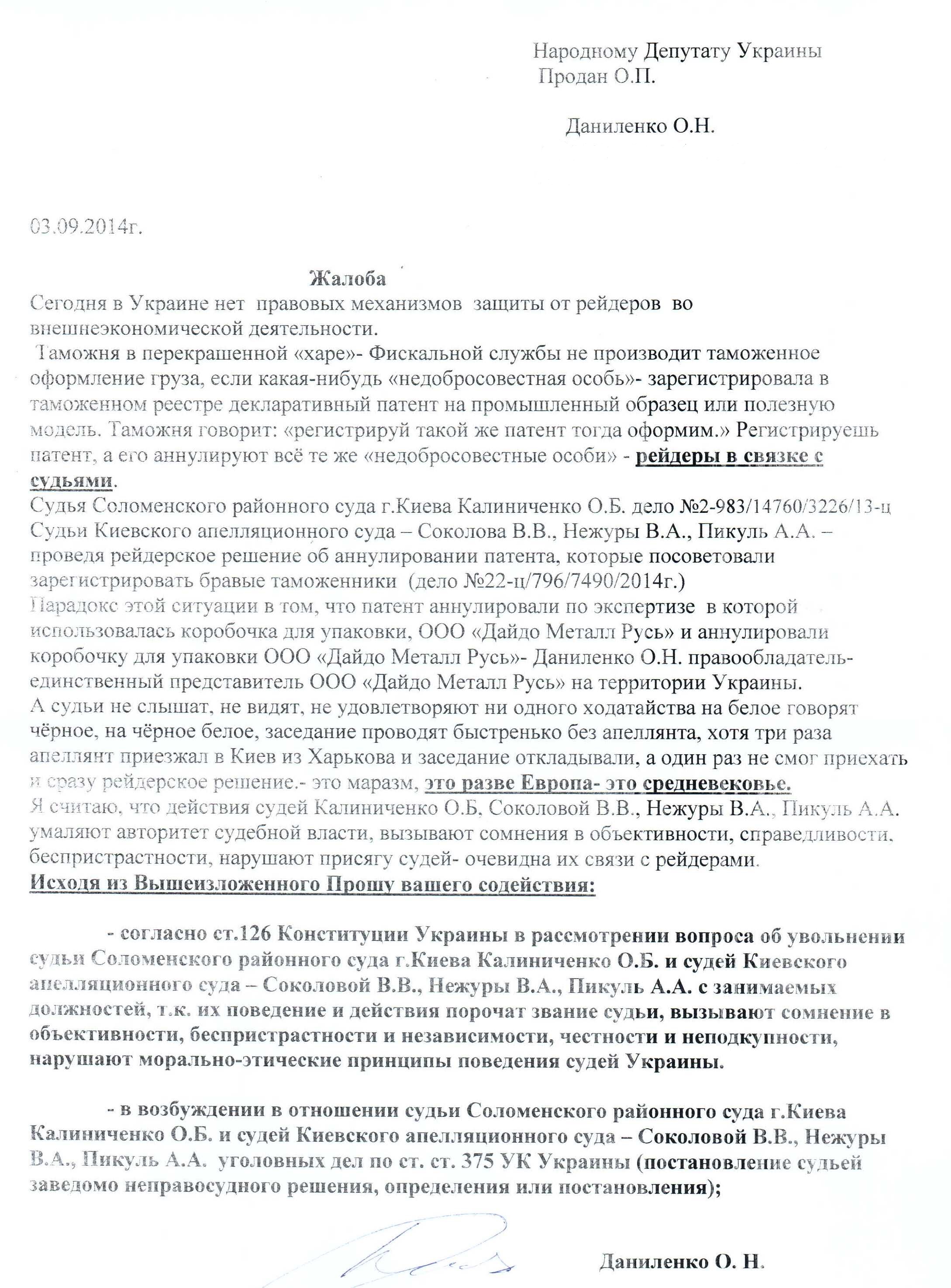 Лист О.М. Даниленка щодо анулювання патентів через суд