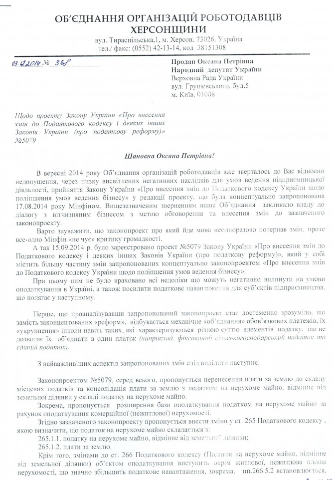 19Січ Коментування вимкнено Лист Об’єднання організацій роботодавців Херсонщини щодо Закону України “Про внесення змін до Податкового кодексу і деяких інших законів України” (про податкову реформу)