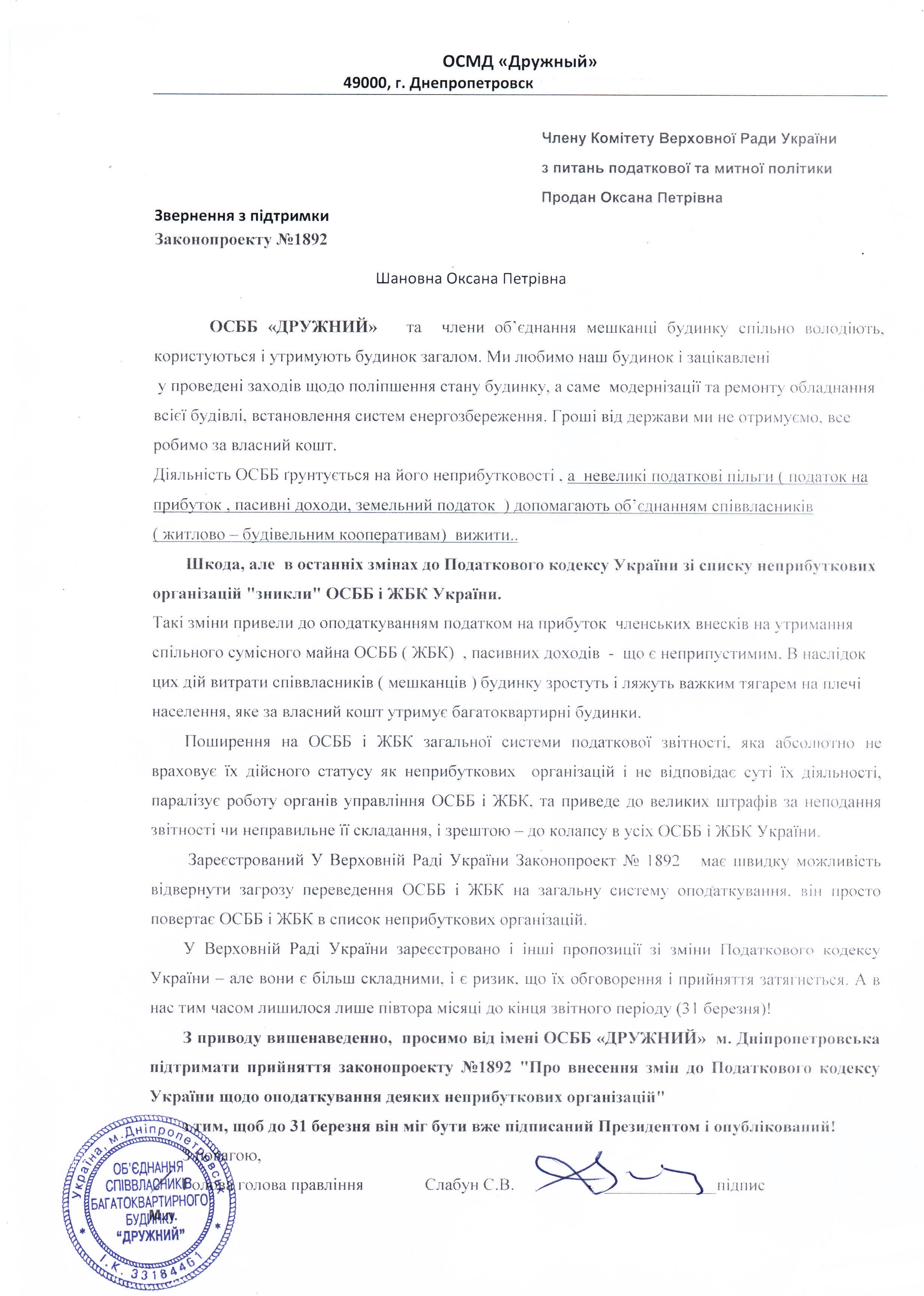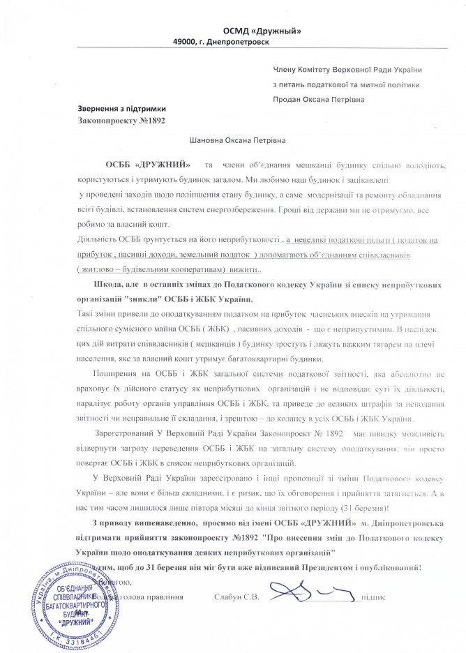 16Бер Коментування вимкнено Лист ОСББ “Дружний″ щодо підтримки законопроекту “Про внесення змін до Податкового кодексу України щодо оподаткування деяких неприбуткових організацій”, реєстр. №1892