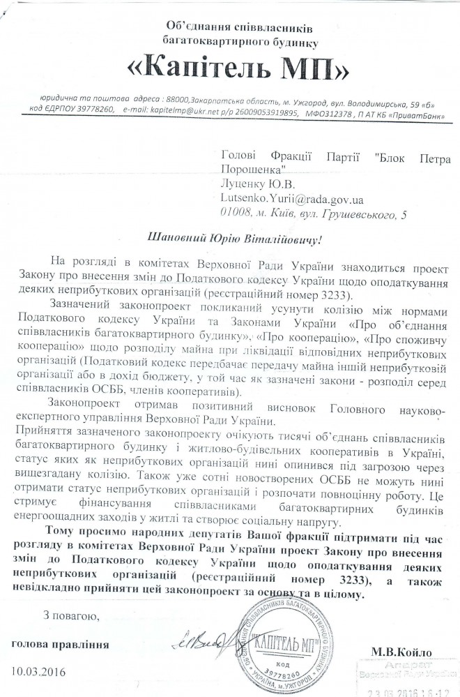 16Тра Коментування вимкнено Лист ОСББ “Капітель МП” щодо підтримки законопроекту “Про внесення змін до Податкового кодексу України щодо оподаткування деяких неприбуткових організацій”, реєстр. №3233