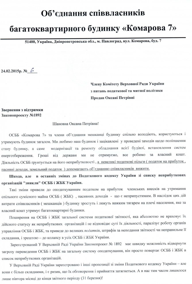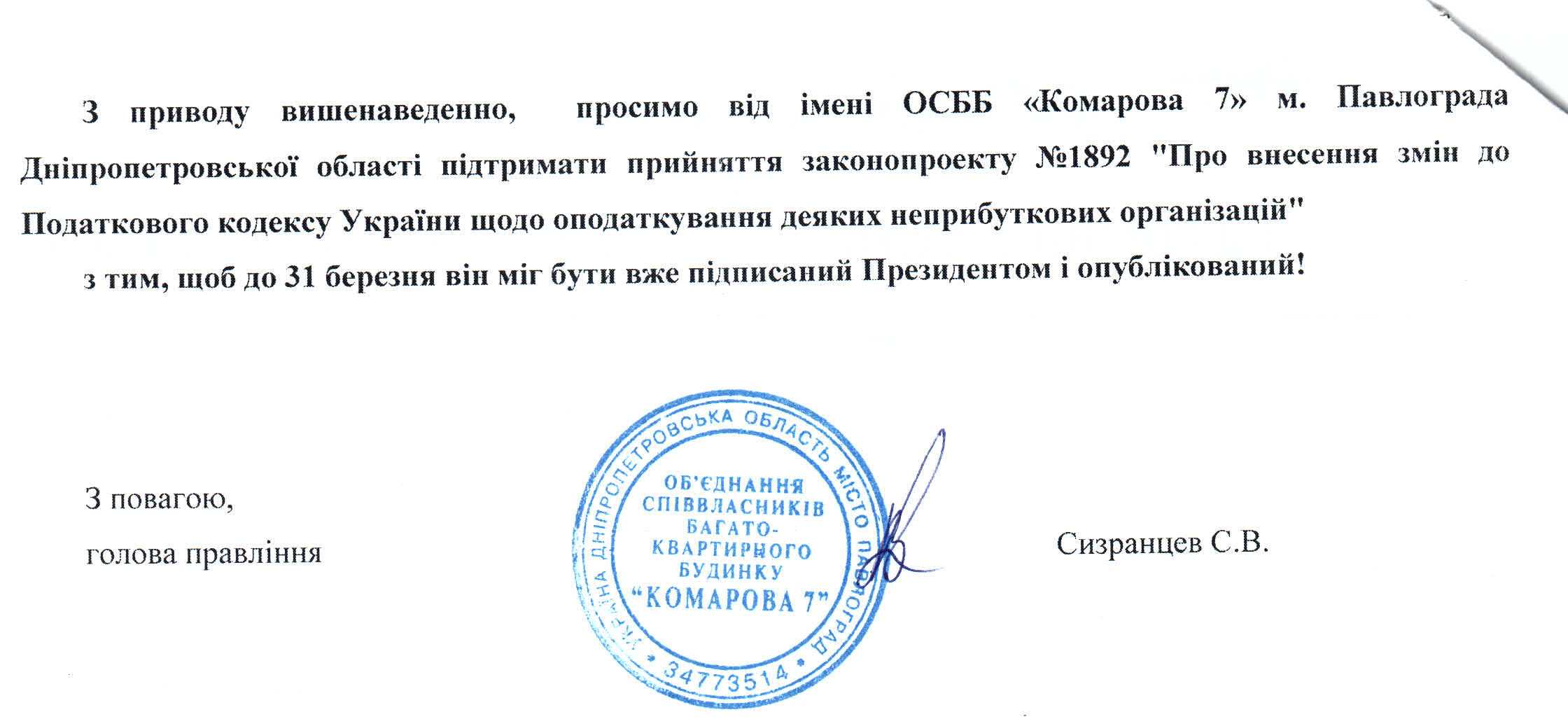 26Бер Коментування вимкнено Лист ОСББ “Комарова, 7″ щодо підтримки законопроекту “Про внесення змін до Податкового кодексу України щодо оподаткування деяких неприбуткових організацій”, реєстр. №1892