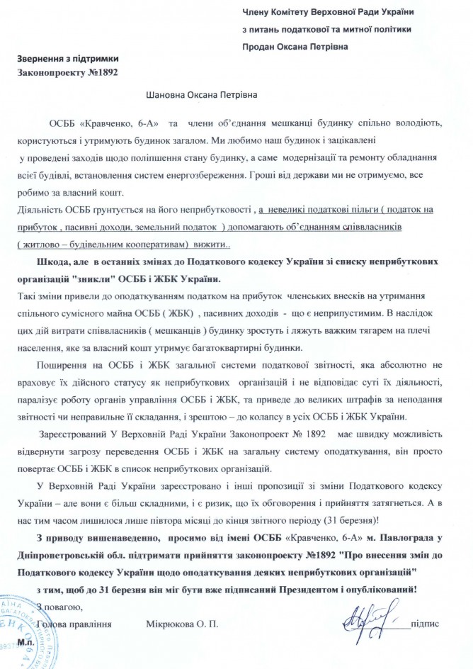 30Бер Коментування вимкнено Лист ОСББ “Кравченко, 6А″ щодо підтримки законопроекту “Про внесення змін до Податкового кодексу України щодо оподаткування деяких неприбуткових організацій”, реєстр. №1892