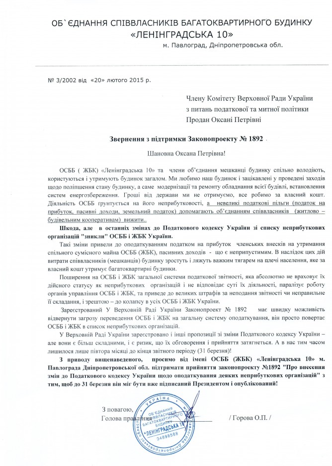 12Бер Коментування вимкнено Лист ОСББ “Ленінградська, 10″ щодо підтримки законопроекту “Про внесення змін до Податкового кодексу України щодо оподаткування деяких неприбуткових організацій”, реєстр. №1892