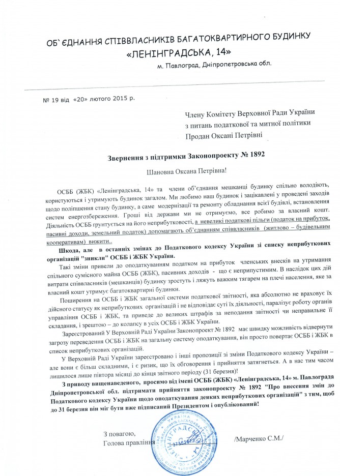 Головна > Верховна Рада України > Вхідна документація > Лист ОСББ “Ленінградська, 14″ щодо підтримки законопроекту “Про внесення змін до Податкового кодексу України щодо оподаткування деяких неприбуткових організацій”, реєстр. №1892