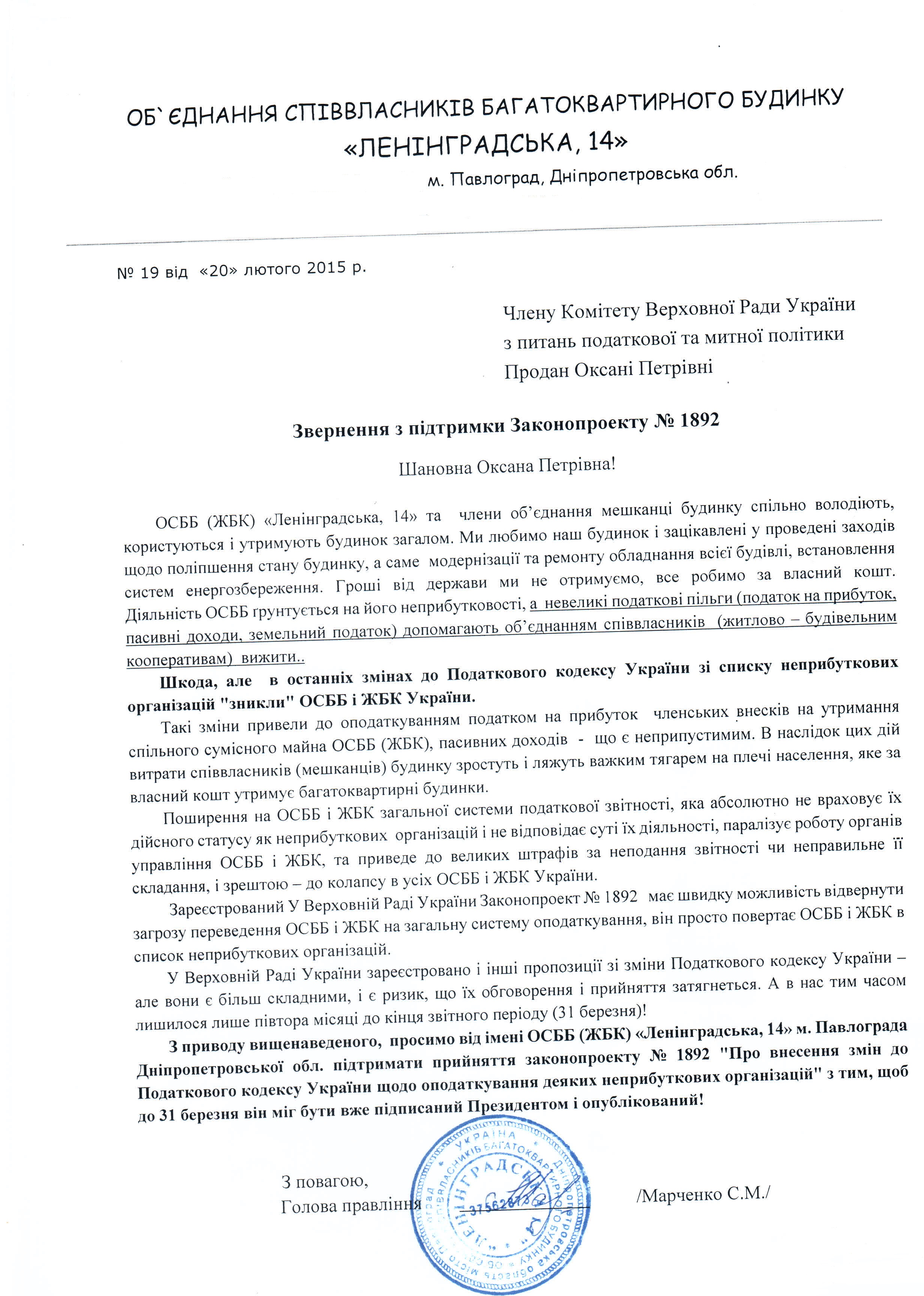 Лист ОСББ “Ленінградська, 14″ щодо підтримки законопроекту “Про внесення змін до Податкового кодексу України щодо оподаткування деяких неприбуткових організацій”, реєстр. №1892