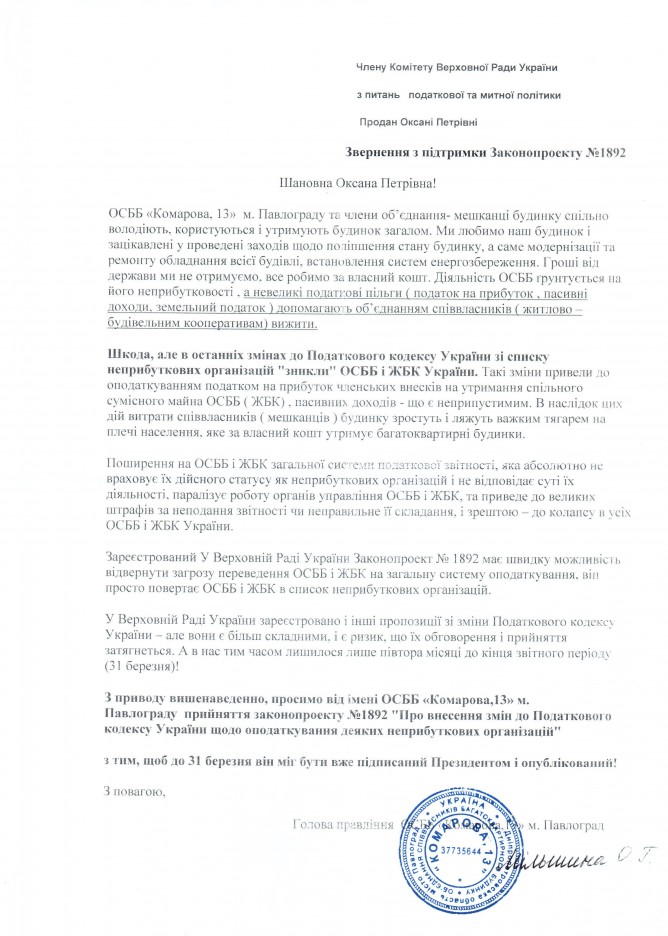 Головна > Верховна Рада України > Вхідна документація > Лист ОСББ “Ленінградська, 35″ щодо підтримки законопроекту “Про внесення змін до Податкового кодексу України щодо оподаткування деяких неприбуткових організацій”, реєстр. №1892
