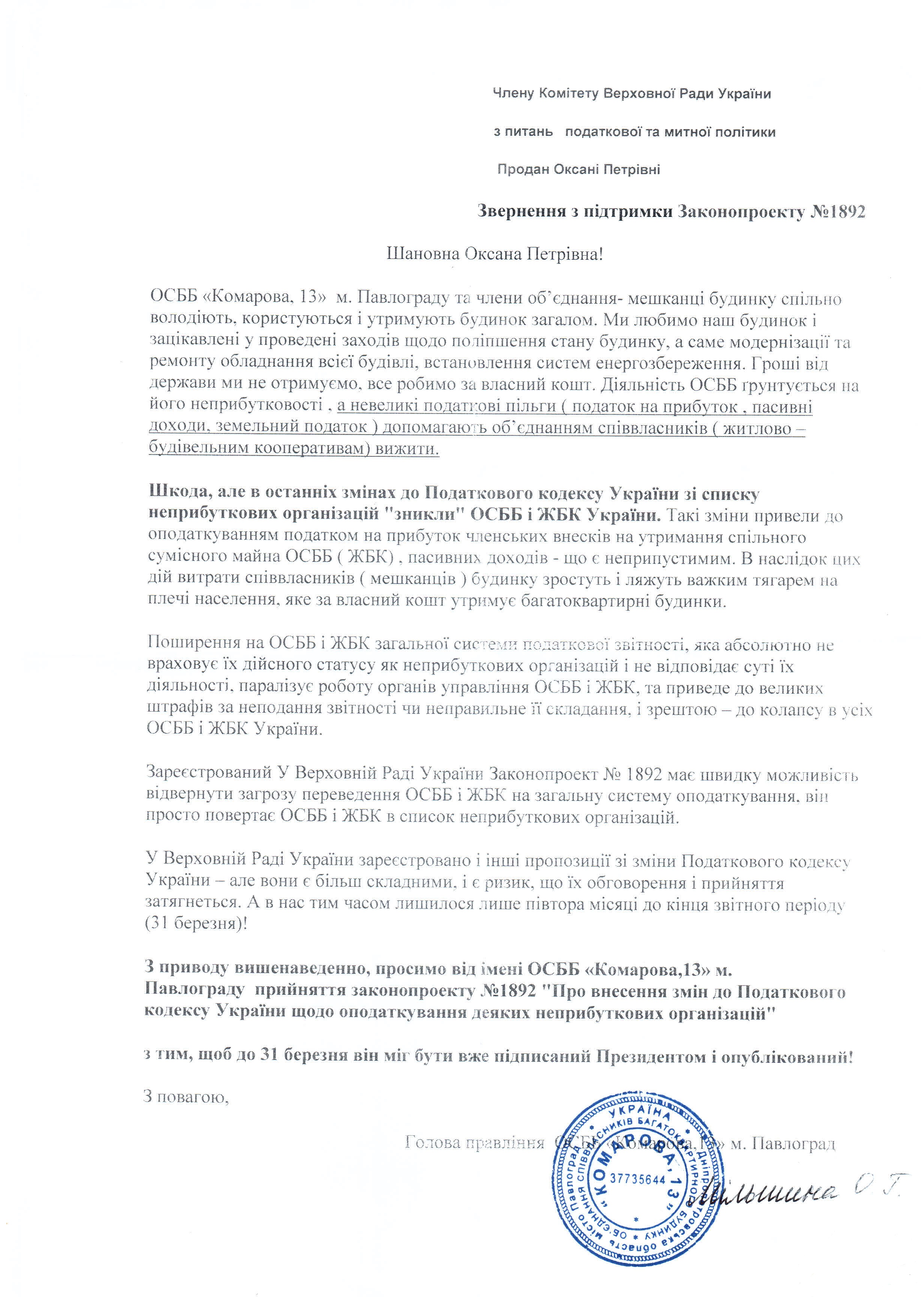 Лист ОСББ “Ленінградська, 35″ щодо підтримки законопроекту “Про внесення змін до Податкового кодексу України щодо оподаткування деяких неприбуткових організацій”, реєстр. №1892