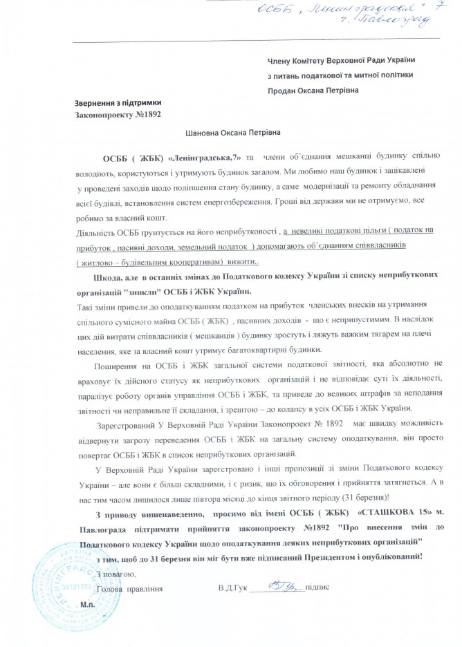 16Бер Коментування вимкнено Лист ОСББ “Ленінградська, 7″ щодо підтримки законопроекту “Про внесення змін до Податкового кодексу України щодо оподаткування деяких неприбуткових організацій”, реєстр. №1892