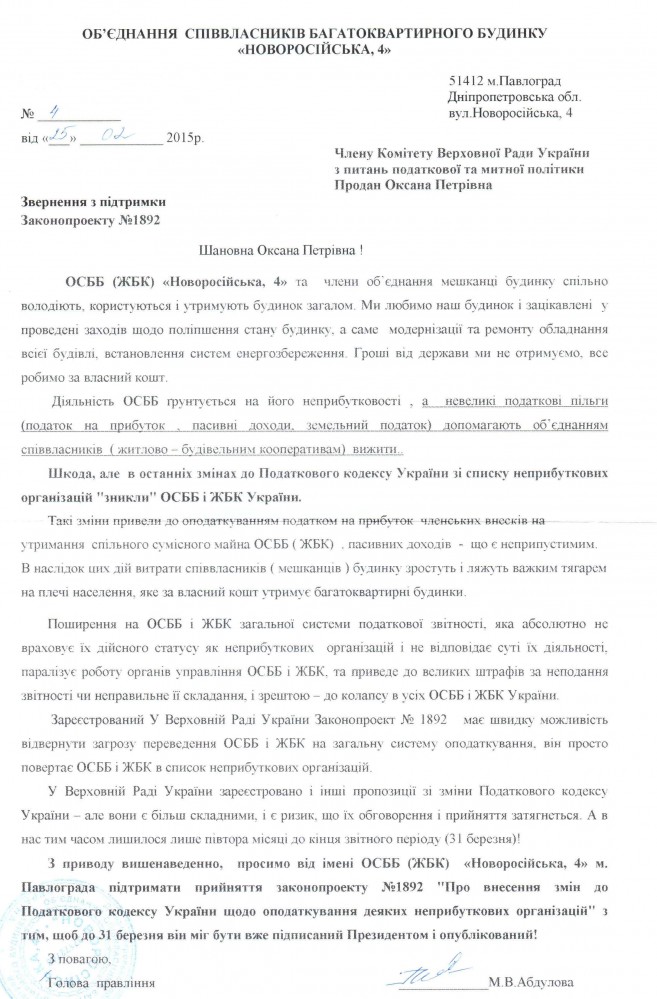 27Бер Коментування вимкнено Лист ОСББ “Новоросійська, 4″ щодо підтримки законопроекту “Про внесення змін до Податкового кодексу України щодо оподаткування деяких неприбуткових організацій”, реєстр. №1892