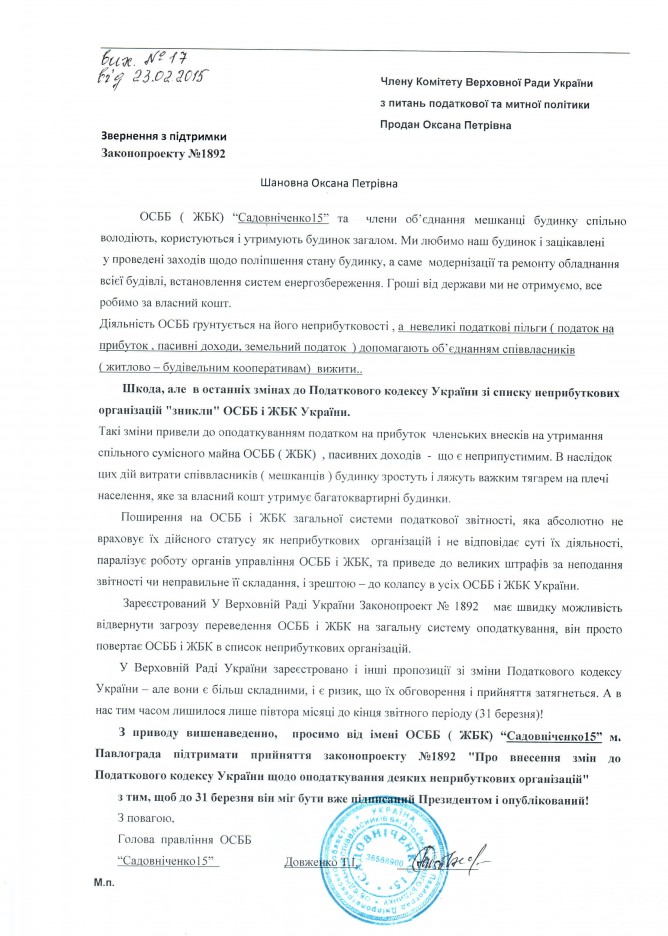 25Бер Коментування вимкнено Лист ОСББ “Садовніченко, 15″ щодо підтримки законопроекту “Про внесення змін до Податкового кодексу України щодо оподаткування деяких неприбуткових організацій”, реєстр. №1892