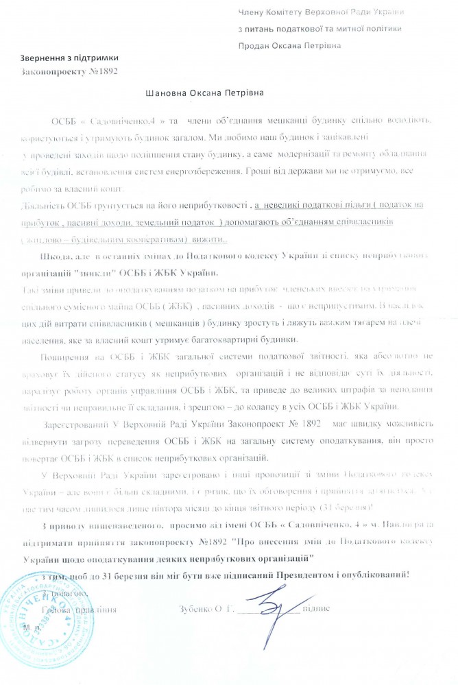 Головна > Верховна Рада України > Вхідна документація > Лист ОСББ “Садовніченко, 4″ щодо підтримки законопроекту “Про внесення змін до Податкового кодексу України щодо оподаткування деяких неприбуткових організацій”, реєстр. №1892