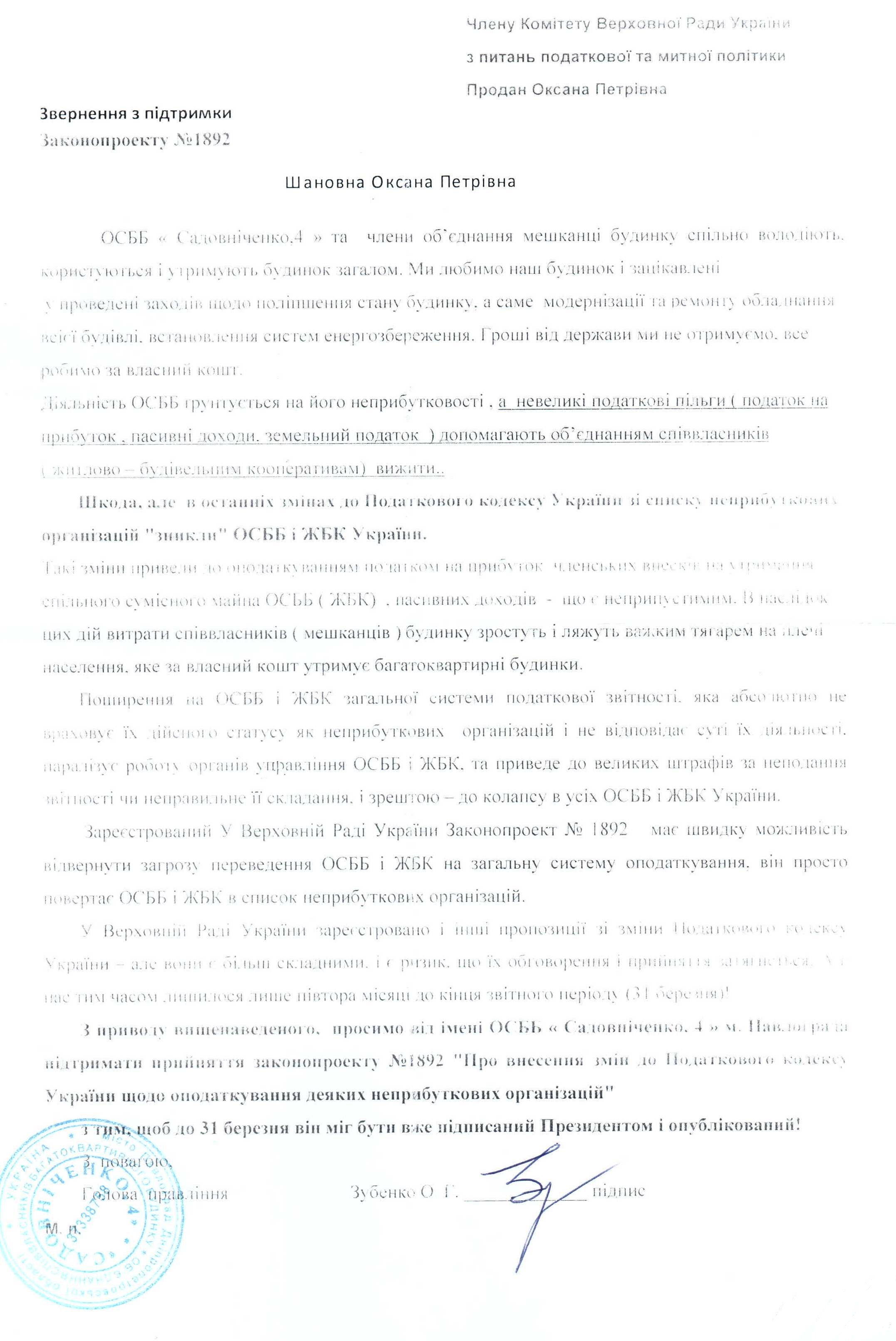 Лист ОСББ “Садовніченко, 4″ щодо підтримки законопроекту “Про внесення змін до Податкового кодексу України щодо оподаткування деяких неприбуткових організацій”, реєстр. №1892