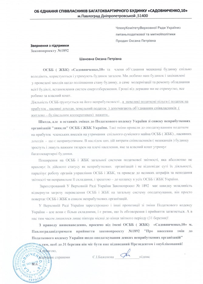 17Бер Коментування вимкнено Лист ОСББ “Садовниченко, 10″ щодо підтримки законопроекту “Про внесення змін до Податкового кодексу України щодо оподаткування деяких неприбуткових організацій”, реєстр. №1892