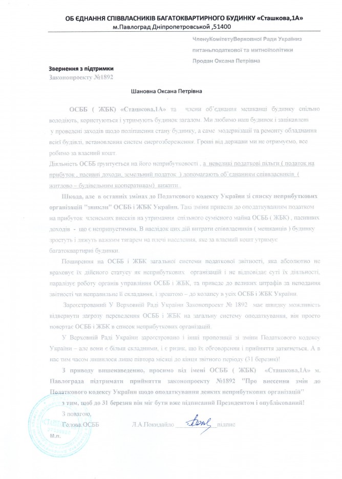 Головна > Верховна Рада України > Вхідна документація > Лист ОСББ “Сташкова, 1А″ щодо підтримки законопроекту “Про внесення змін до Податкового кодексу України щодо оподаткування деяких неприбуткових організацій”, реєстр. №1892