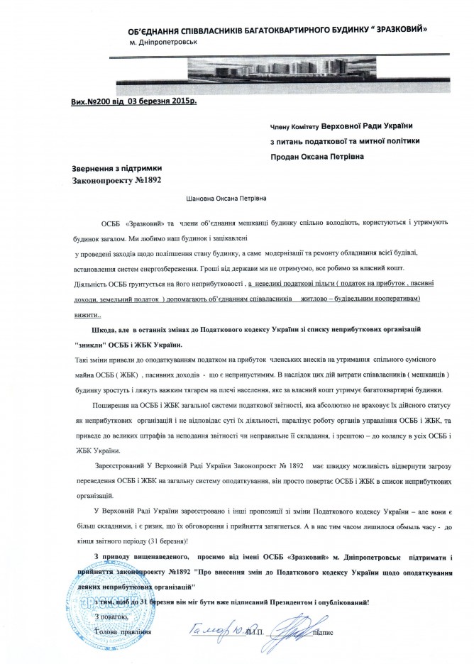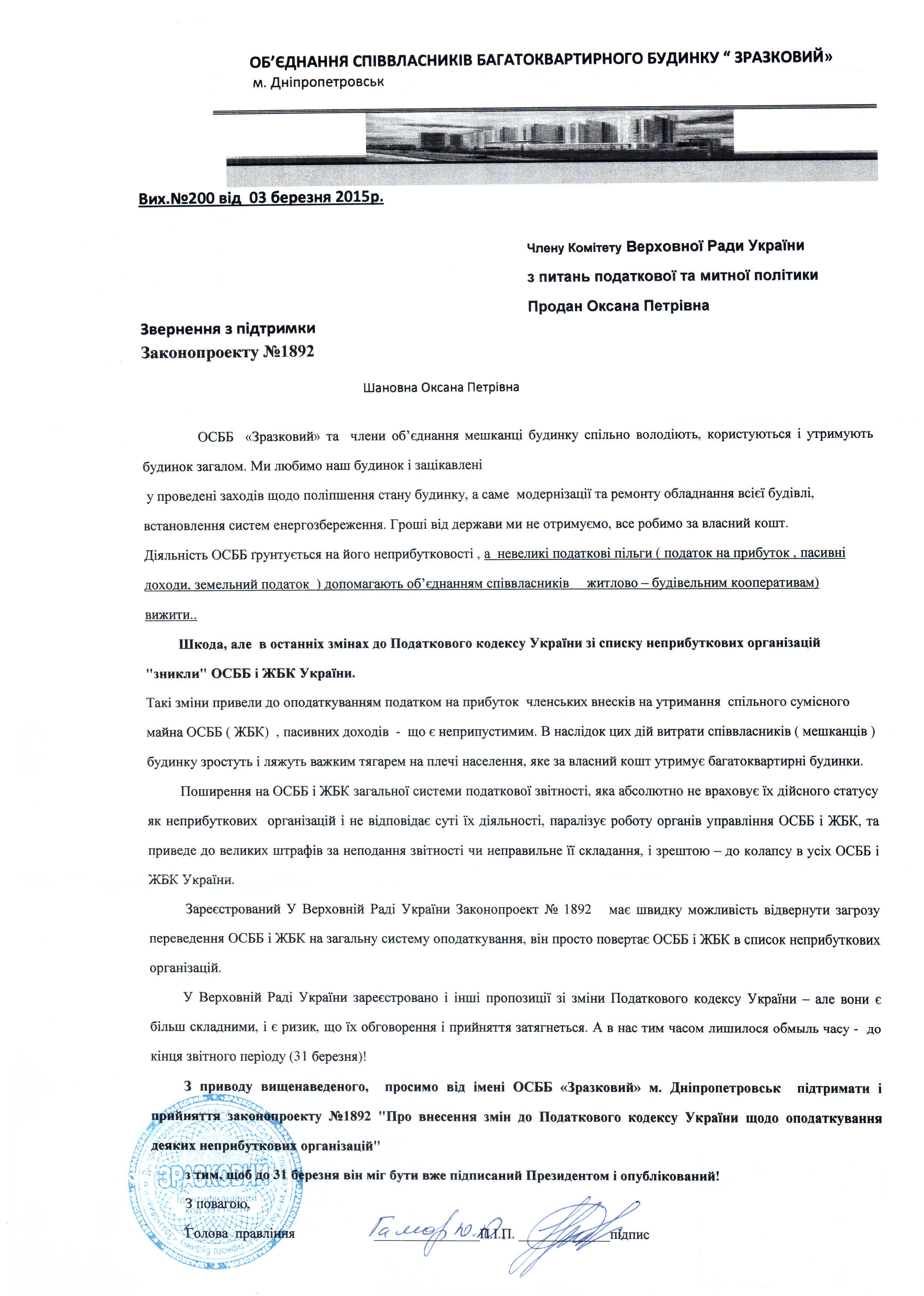 23Бер Коментування вимкнено Лист ОСББ “Зразковий″ щодо підтримки законопроекту “Про внесення змін до Податкового кодексу України щодо оподаткування деяких неприбуткових організацій”, реєстр. №1892