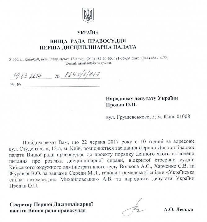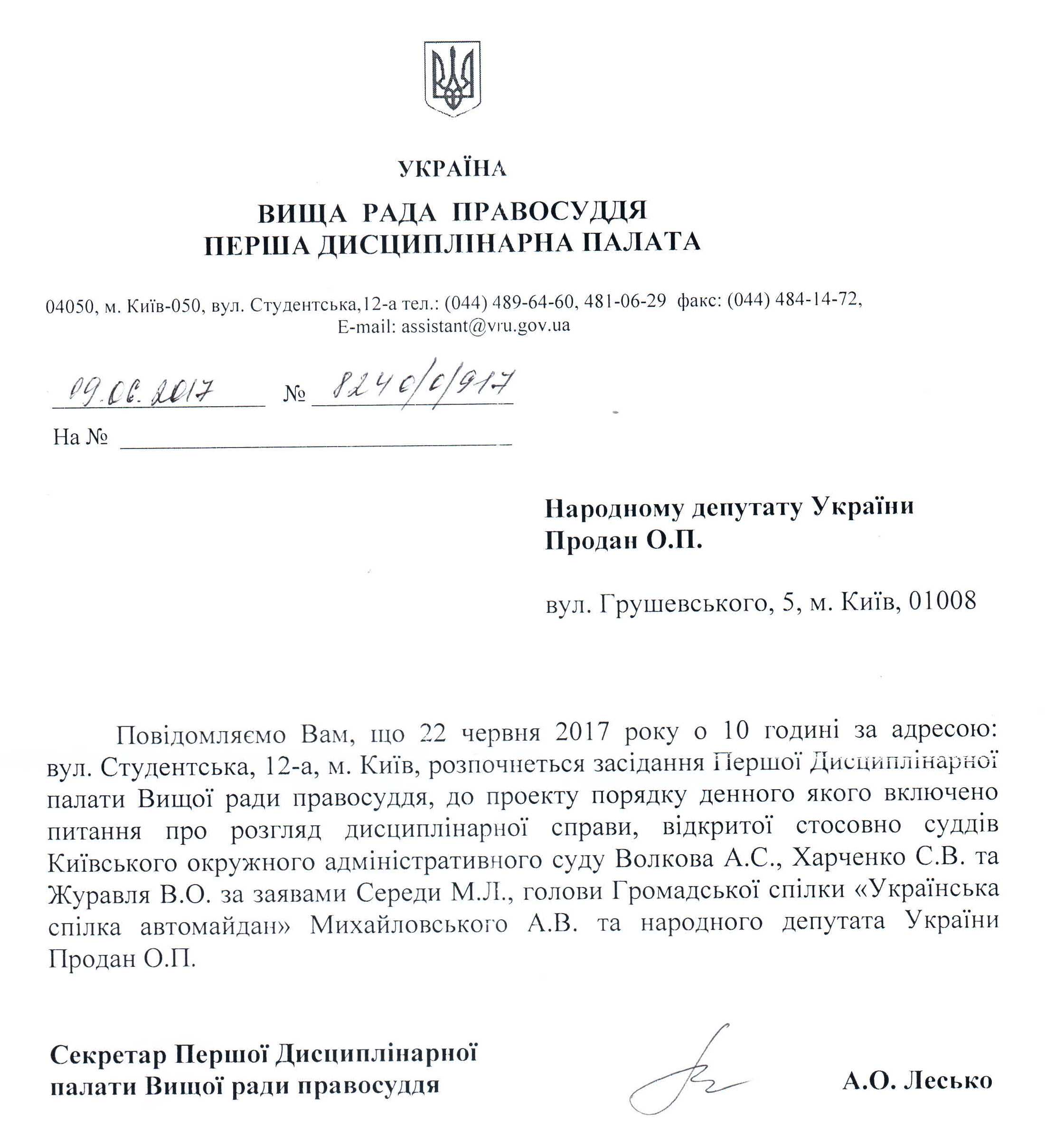 Вхідна документація > Лист Першої Дисциплінарної палати Вищої Ради Правосуддя щодо розгляду дисциплінарної справи стосовно суддів Київського окружного адміністративного суду Волкова А.С., Харченка С.В. та Журавля В.О.