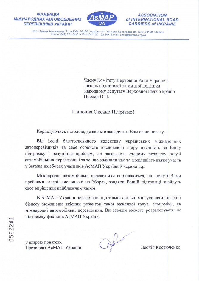21Чер Коментування вимкнено Лист-подяка Асоціації міжнародних автомобільних перевізників України за підтримку автомобільної галузі та участь у Загальних зборах учасників АсМАП