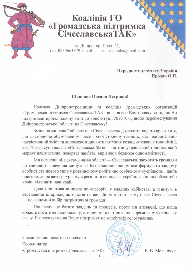28Лют Коментування вимкнено Лист-подяка від Коаліції ГО “Громадська підтримка СічеславськаТАК” за підтримку законопроекту щодо перейменування Дніпропетровської області