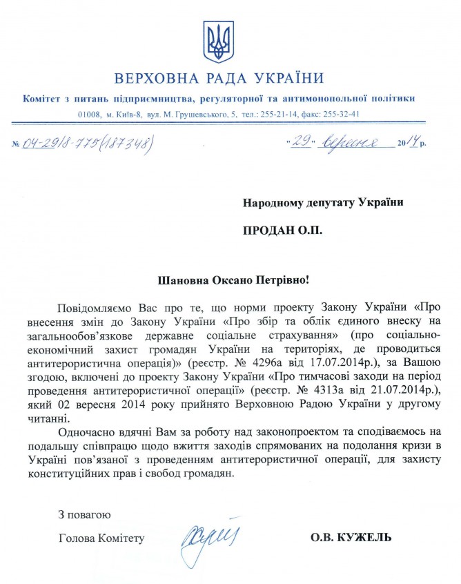13Жов Коментування вимкнено Лист-подяка за спільну роботу над законопроектом від Комітету Верховної Ради України з питань підприємництва, регуляторної та антимонопольної політики