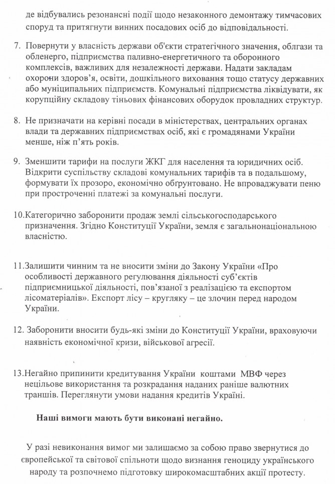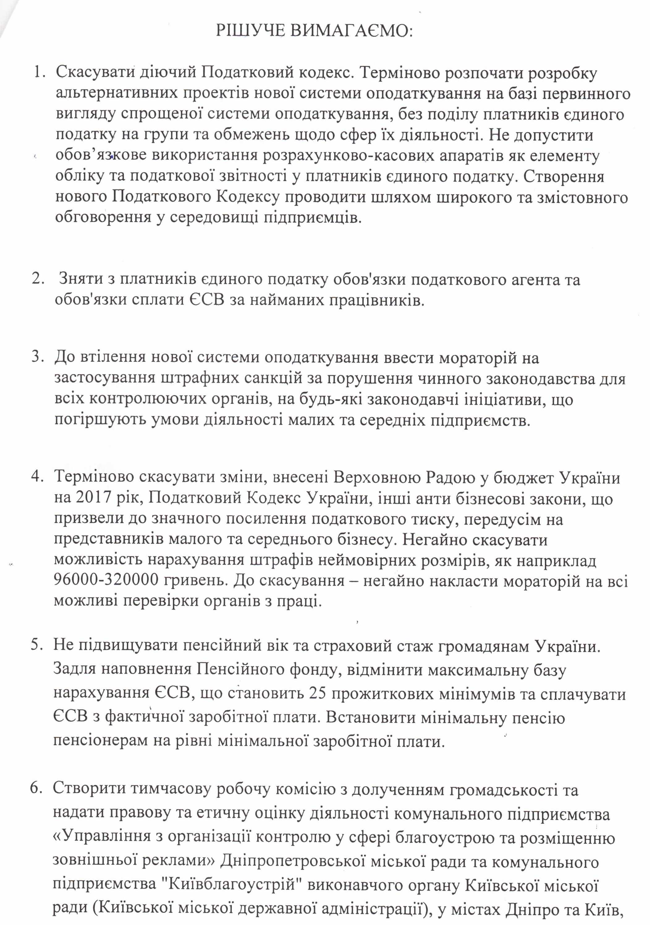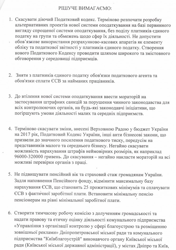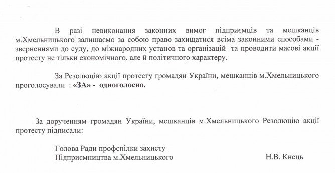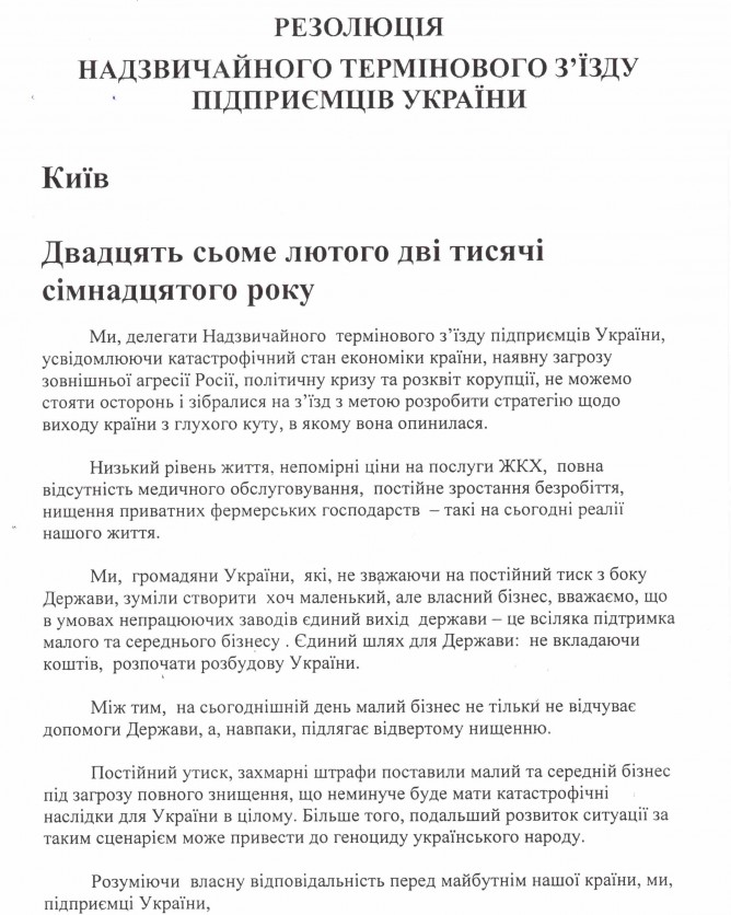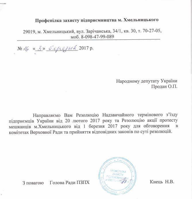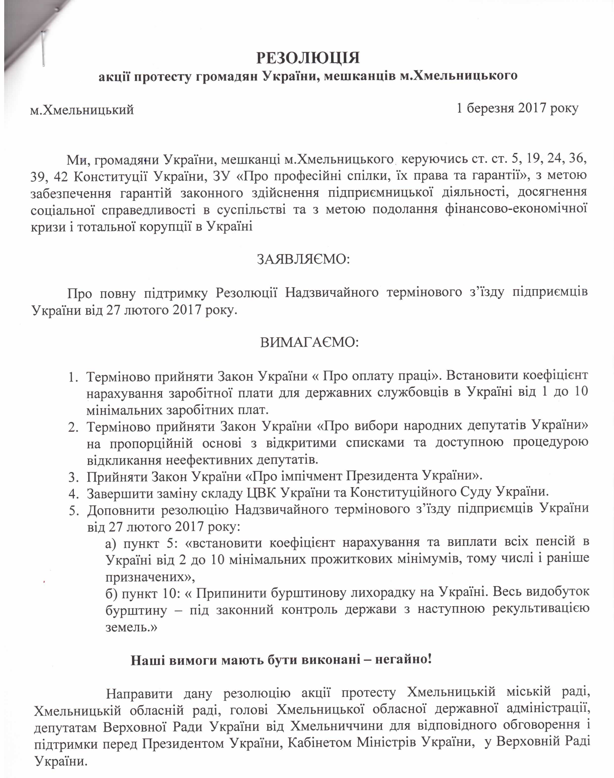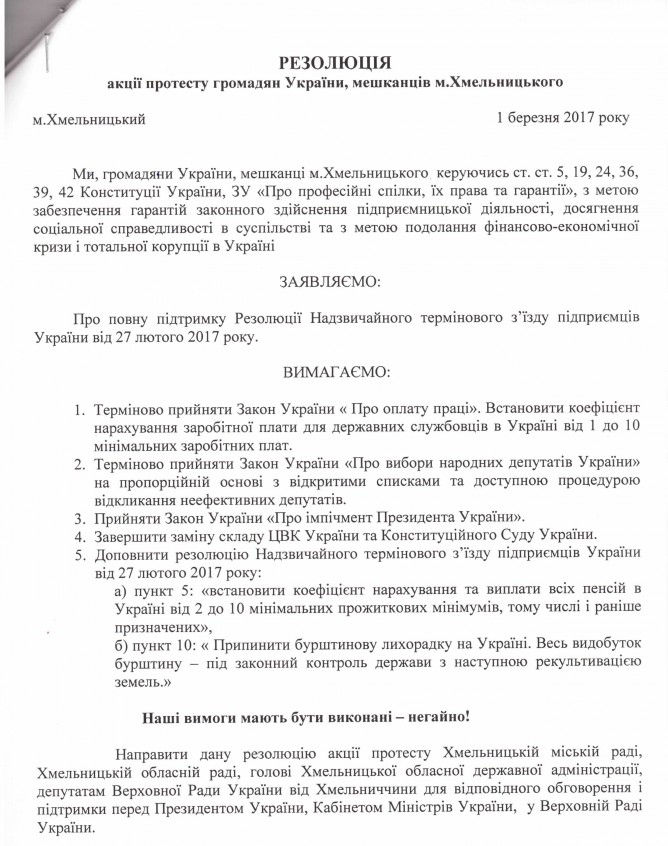 Вхідна документація > Лист Профспілки захисту підприємництва м. Хмельницького з Резолюцією Надзвичайного термінового з’їзду підприємців України від 20.02.2017 та Резолюцією акції протесту мешканців м. Хмельницького від 01.03.2017 року