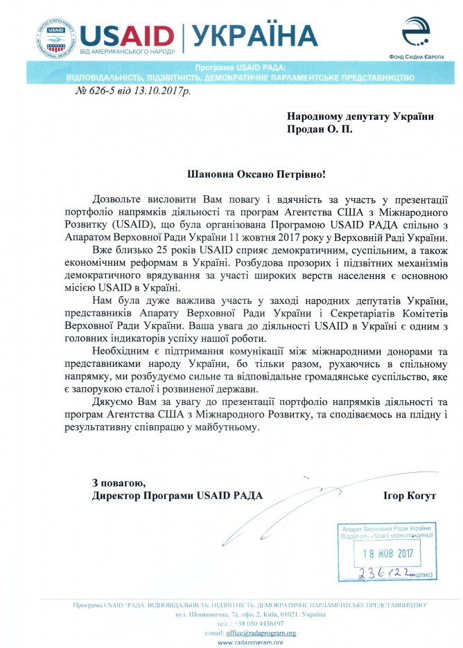 30Жов Коментування вимкнено Лист Програми USAID Рада з подякою за участь у презентації портфоліо напрямків діяльності та програм Агентства США з Міжнародного Розвитку (USAID)