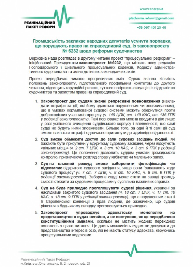 Законопроект 6232 передбачає чимало прогресивних змін. Однак значна кількість положень законопроекту, підготовленого профільним комітетом до ІІ читання, підвищить корупційні ризики, суттєво погіршить ситуацію із відкритістю судочинства та захистом права на справедливий суд.