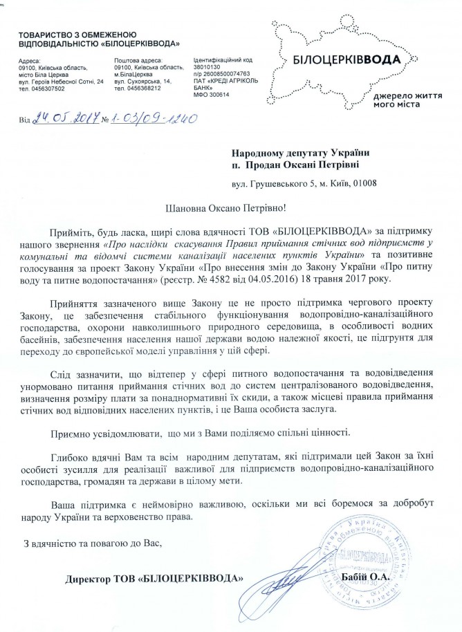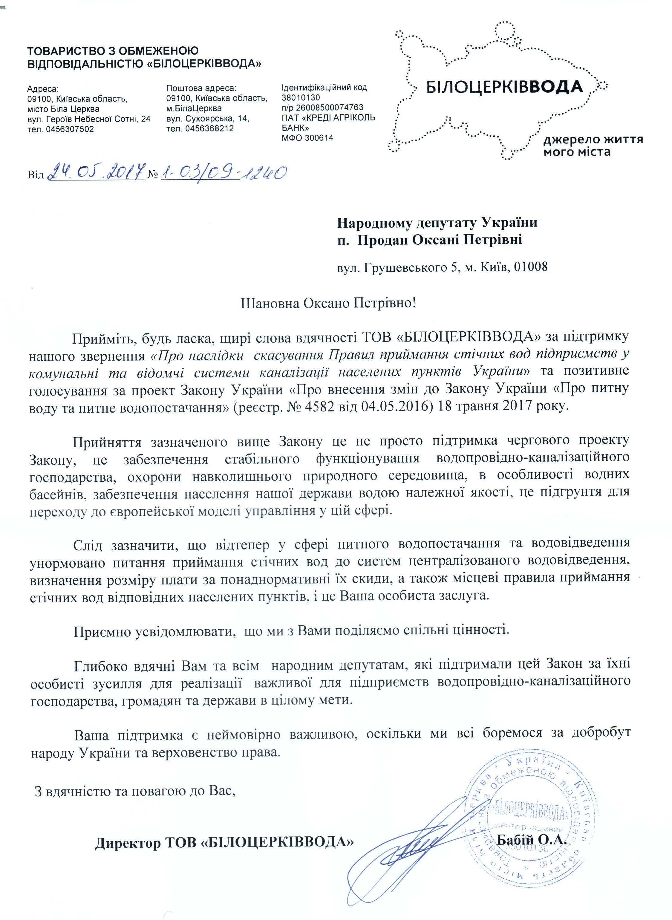 23Чер Коментування вимкнено Лист ТОВ “Білоцерківвода” з подякою за підтримку законопроекту “Про внесення змін до Закону України “Про питну воду та питне водопостачання”, реєстр. №4582
