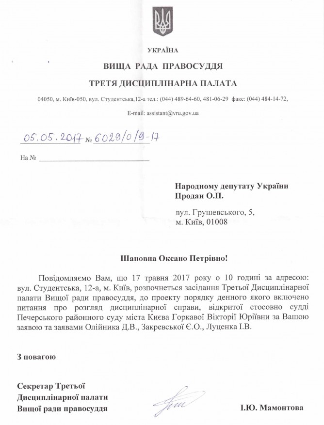 16Тра Коментування вимкнено Лист Третьої Дисциплінарної палати Вищої Ради Правосуддя щодо розгляду дисциплінарної справи стосовно судді Печерського районного суду м. Києва В.Ю. Горкавої ДЕПУТАТСЬКЕ ЗВЕРНЕННЯ