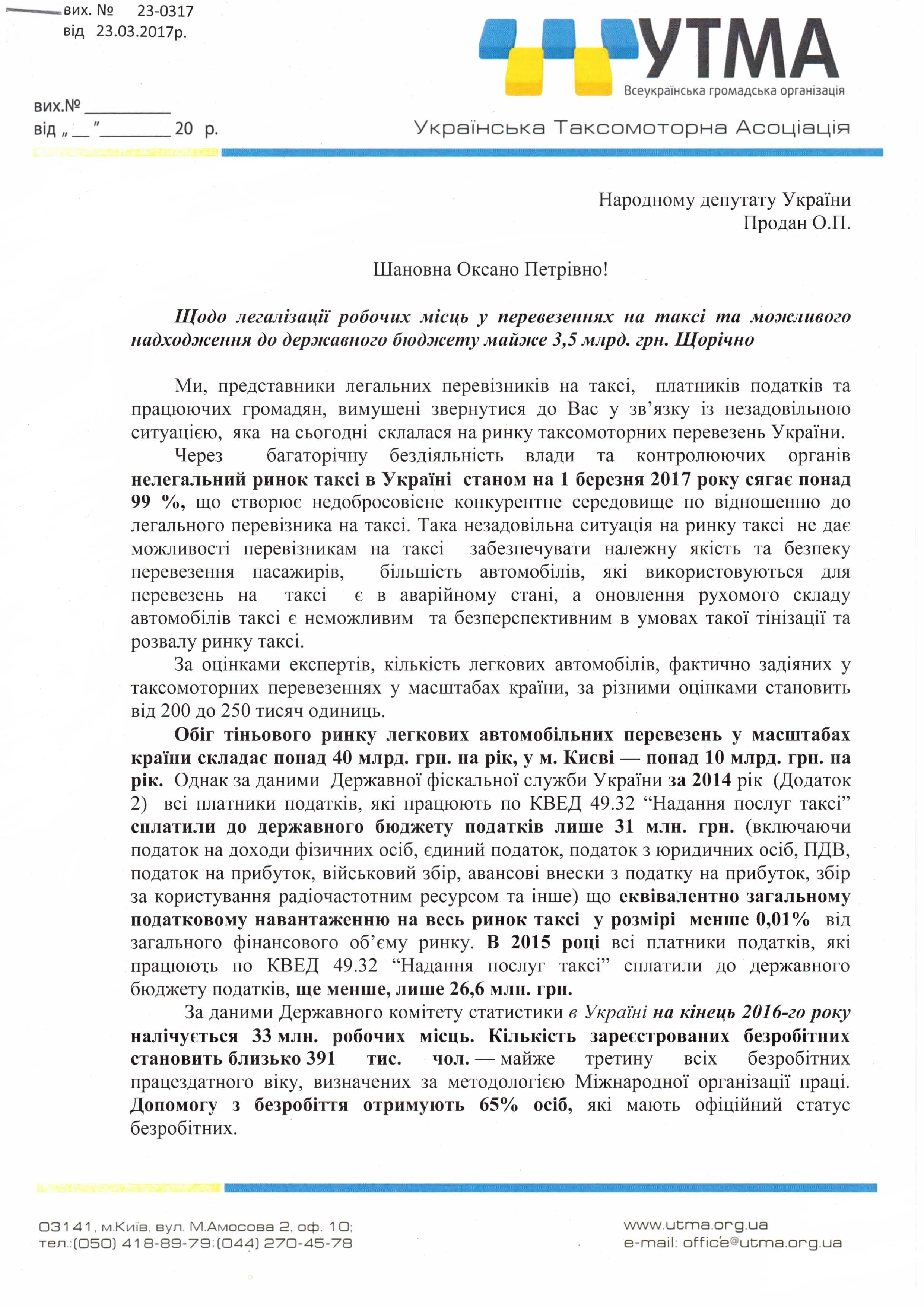 Головна > Верховна Рада України > Вхідна документація > Лист Української Таксомоторної Асоціації щодо проблемних питань діяльності таксі та необхідності внесення змін до законодавства