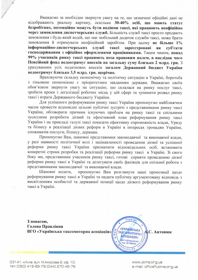 Лист Української Таксомоторної Асоціації щодо проблемних питань діяльності таксі та необхідності внесення змін до законодавства