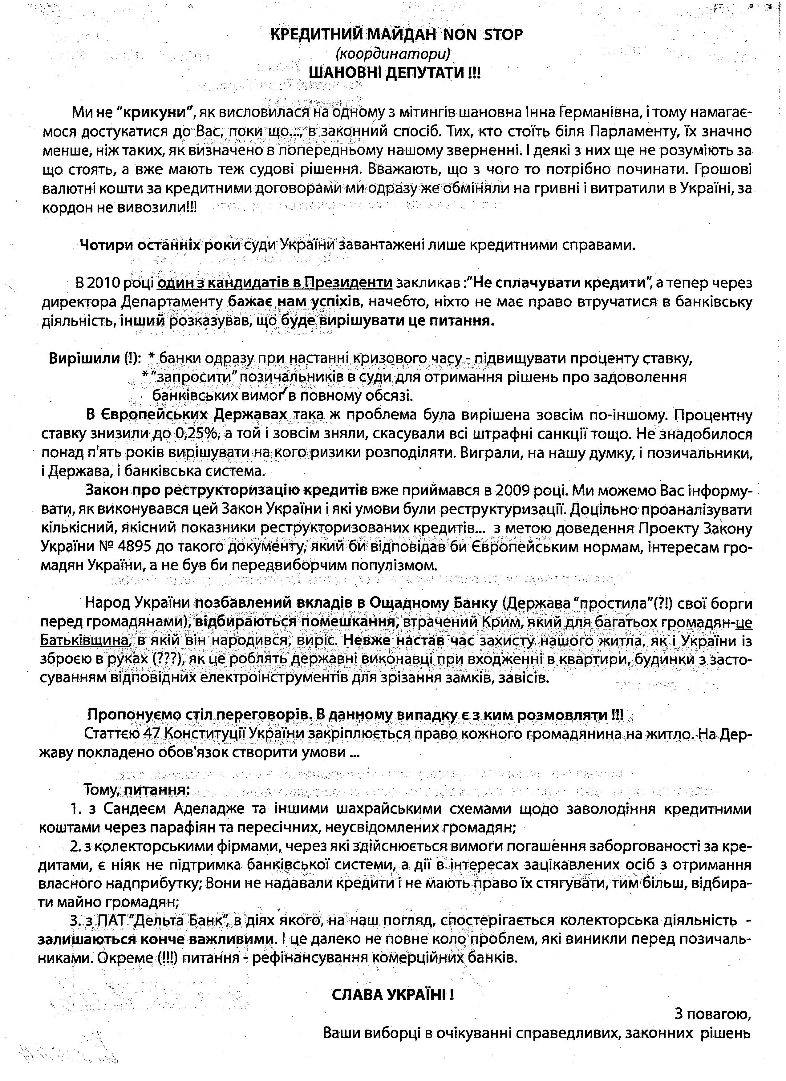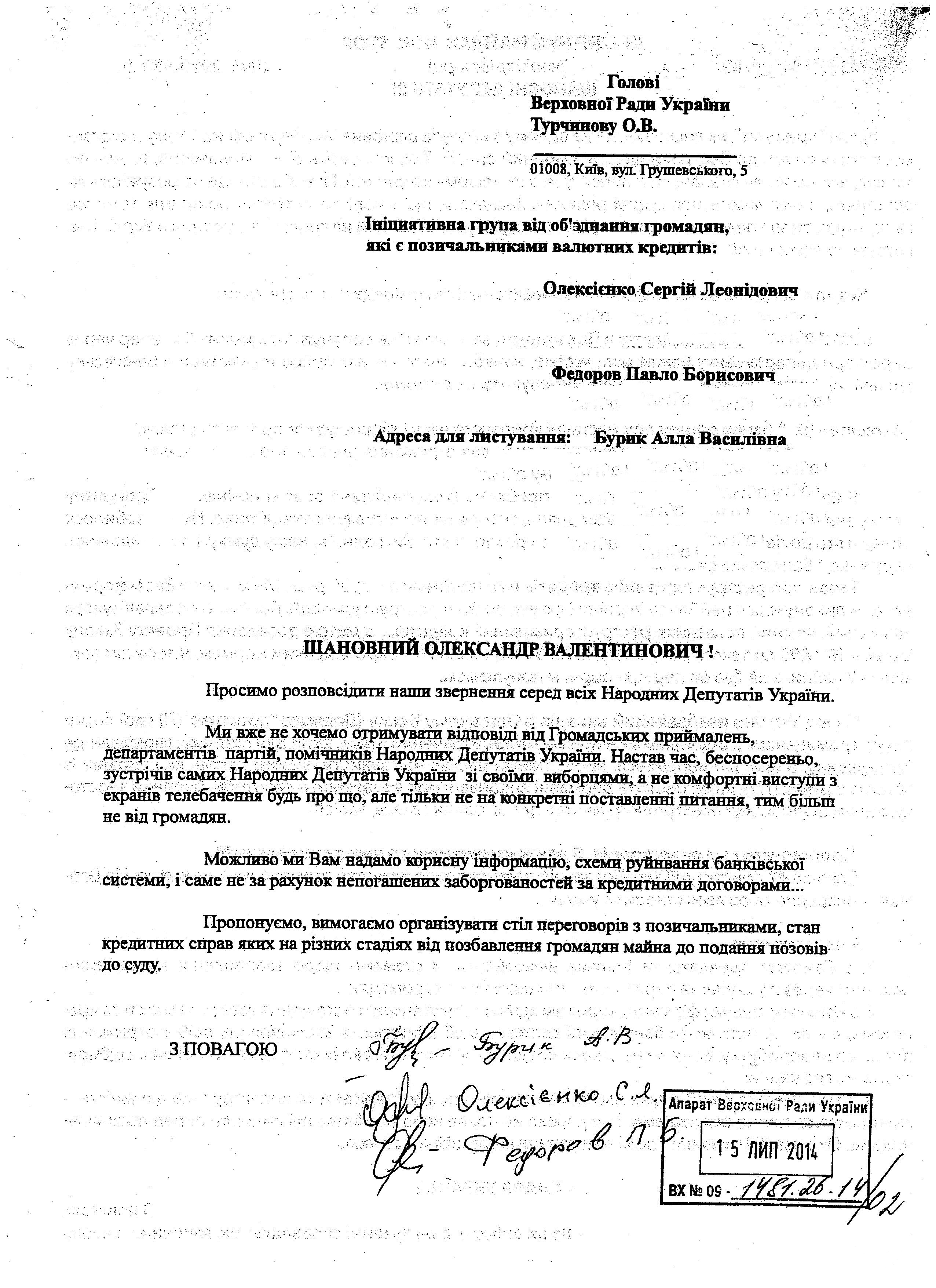 Головна > Верховна Рада України > Вхідна документація > Лист Ініціативної групи від об’єднання громадян, які є позичальниками валютних кредитів, щодо проведення круглого столу з обговорення питань надання банківських кредитів