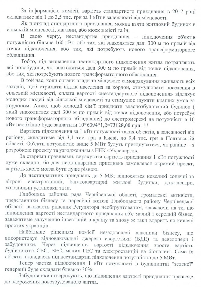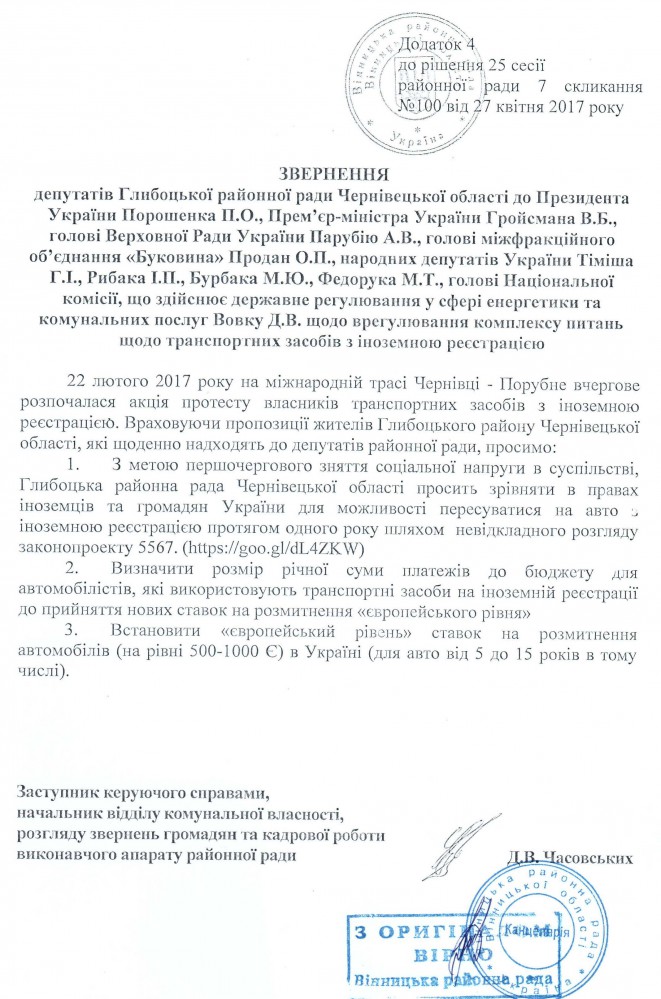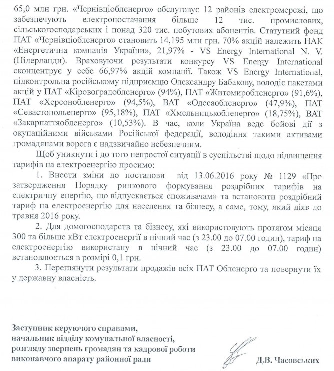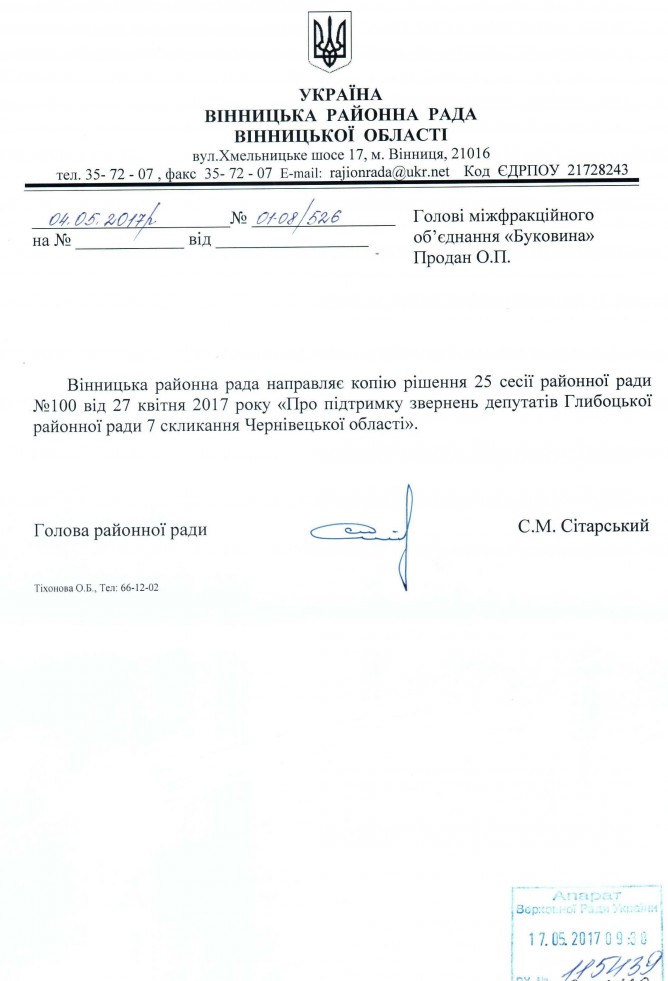 Лист Вінницької районної ради щодо підтримки звернення депутатів Глибоцької районної ради стосовно недопущення підвищення тарифів на електроенергію