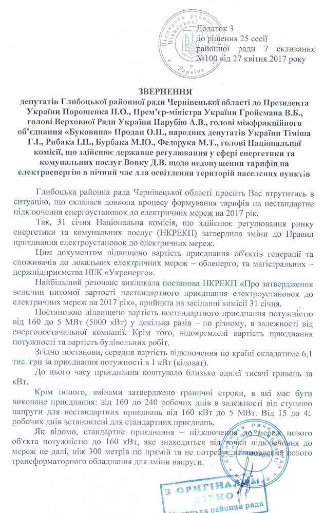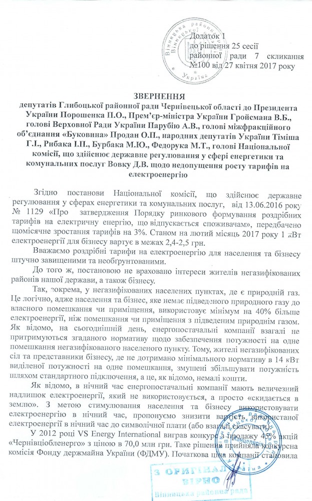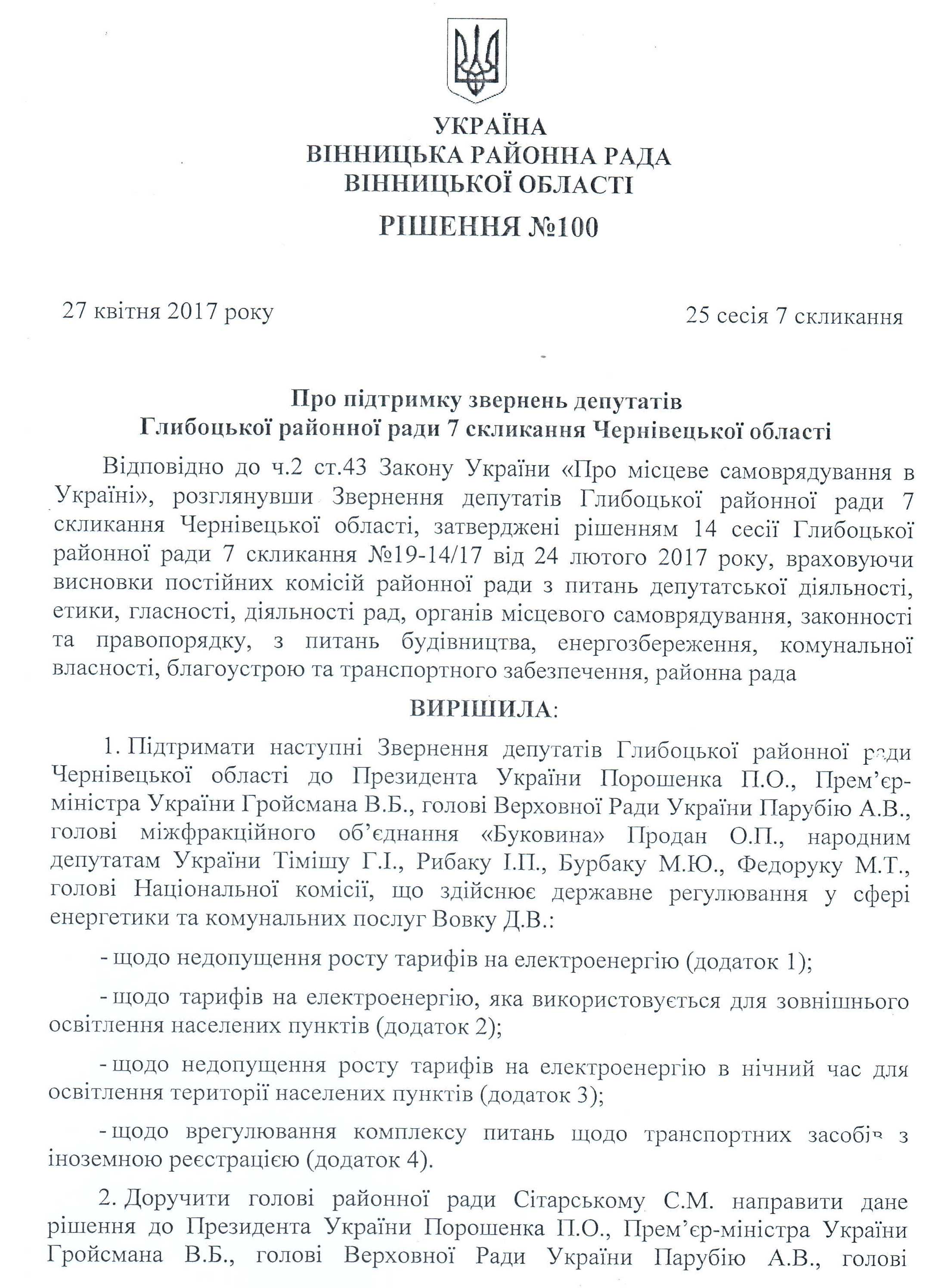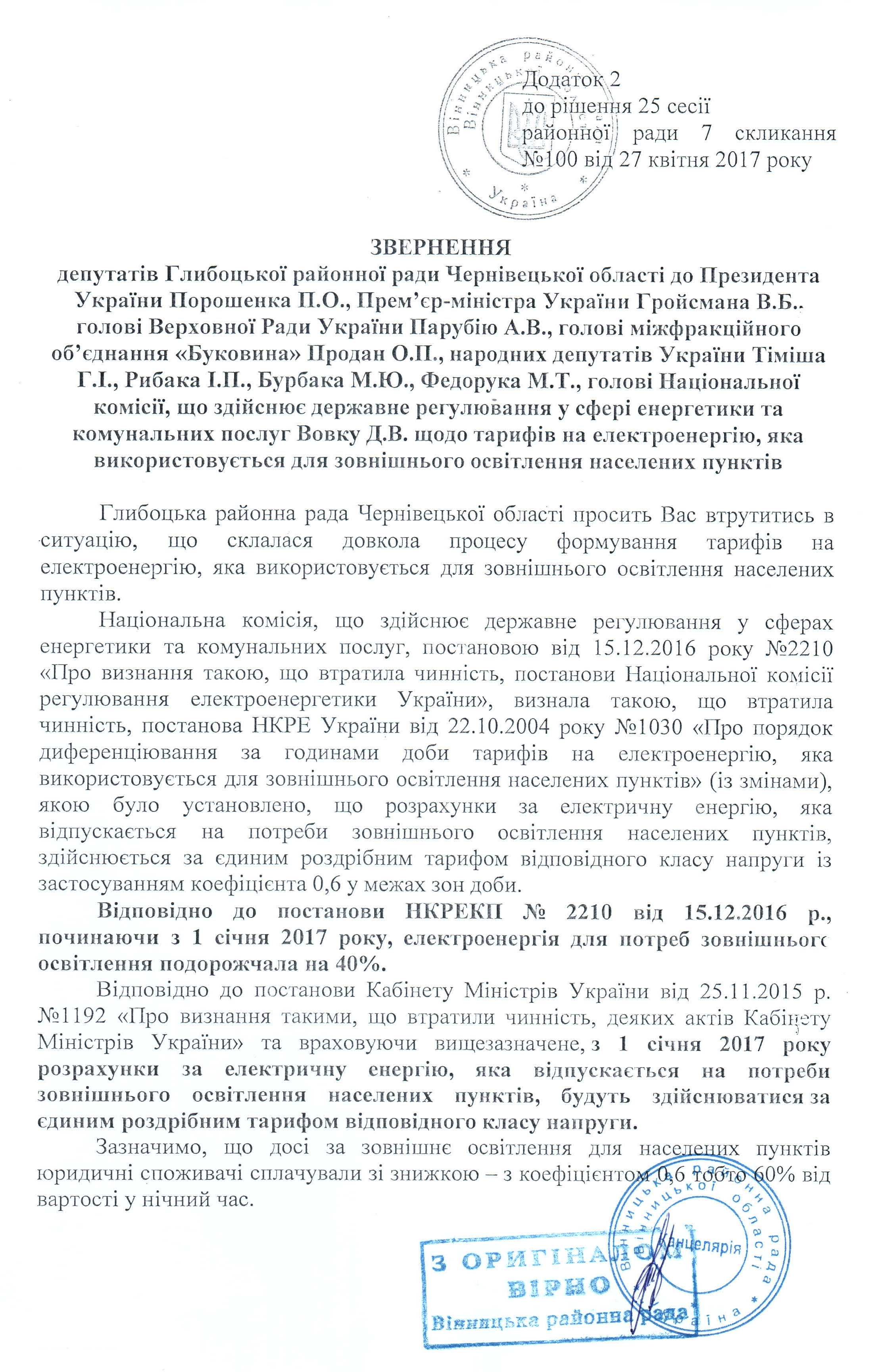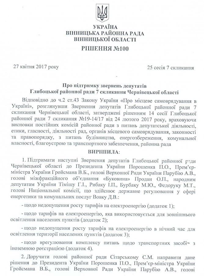 Головна > Верховна Рада України > Вхідна документація > Лист Вінницької районної ради щодо підтримки звернення депутатів Глибоцької районної ради стосовно недопущення підвищення тарифів на електроенергію