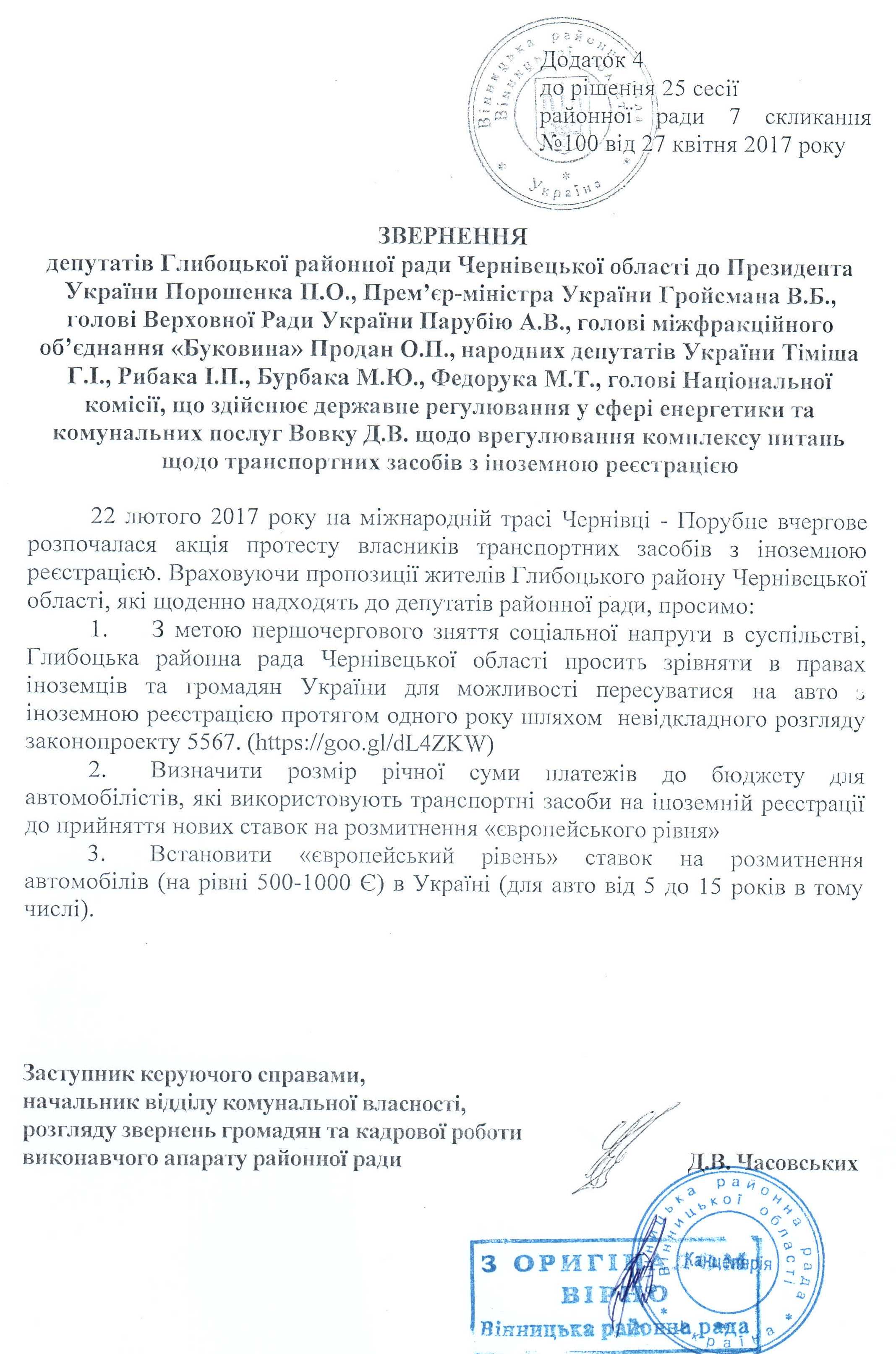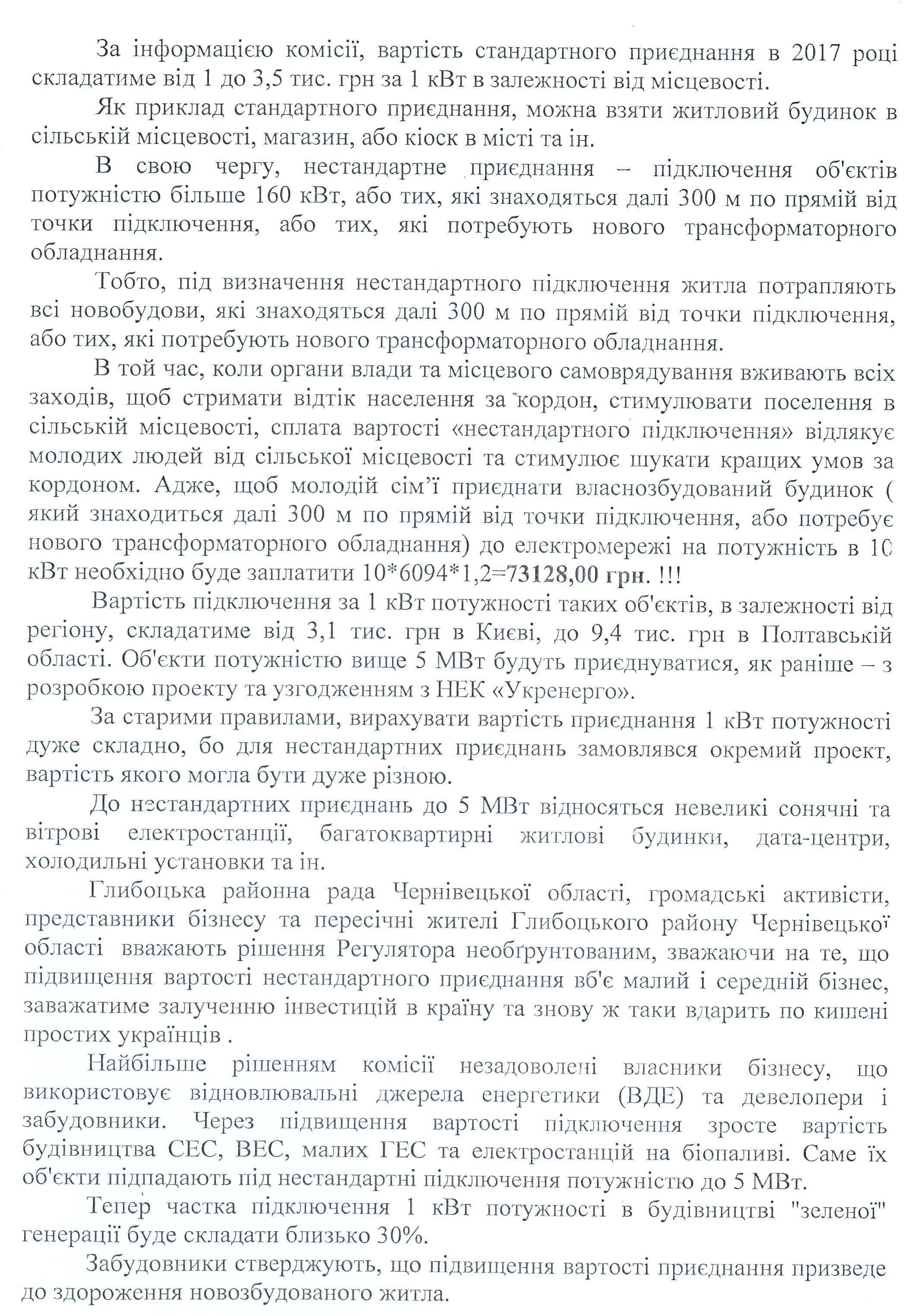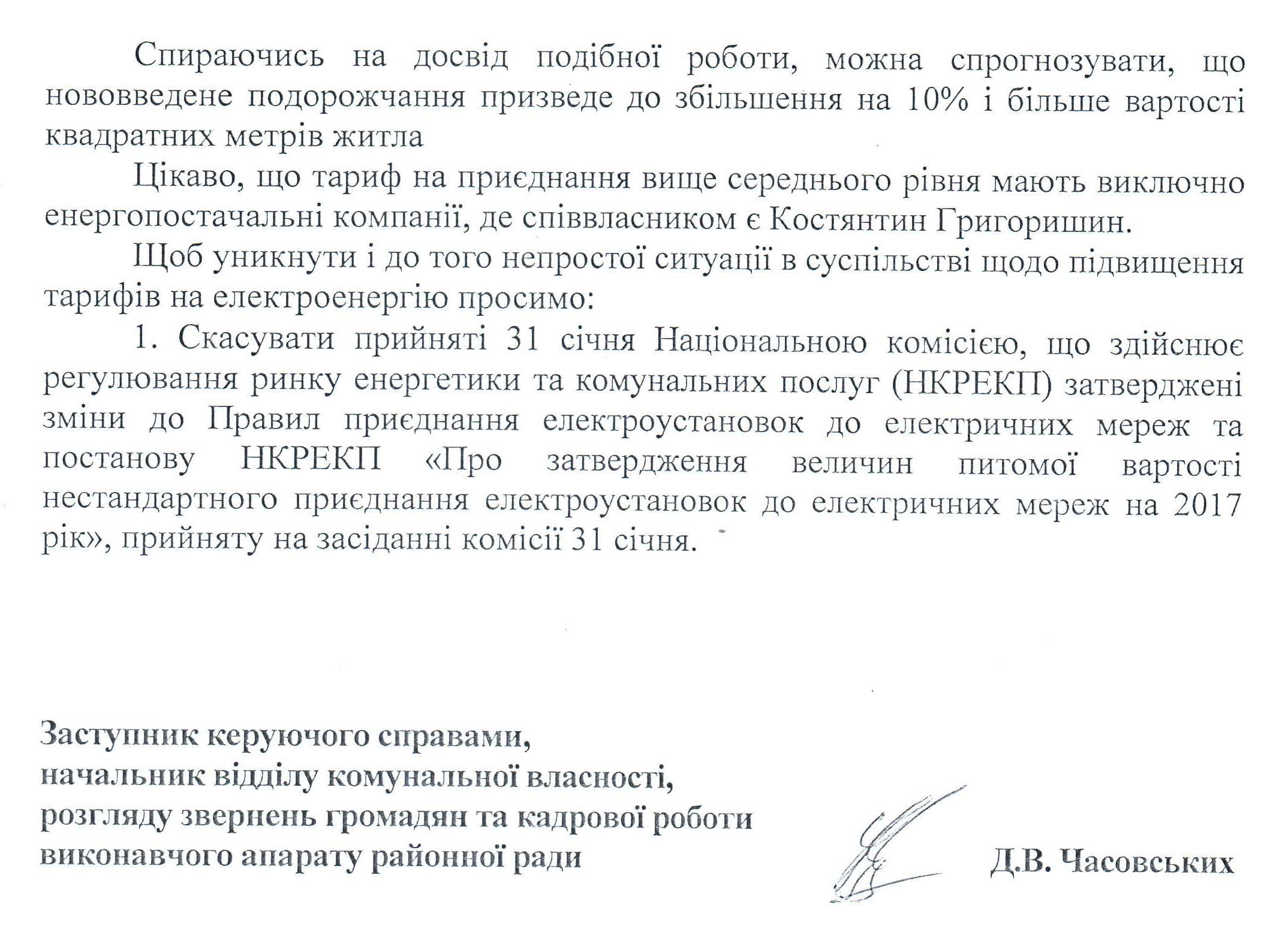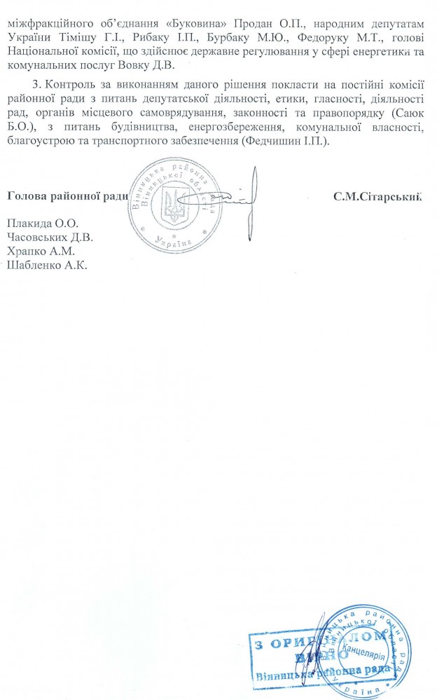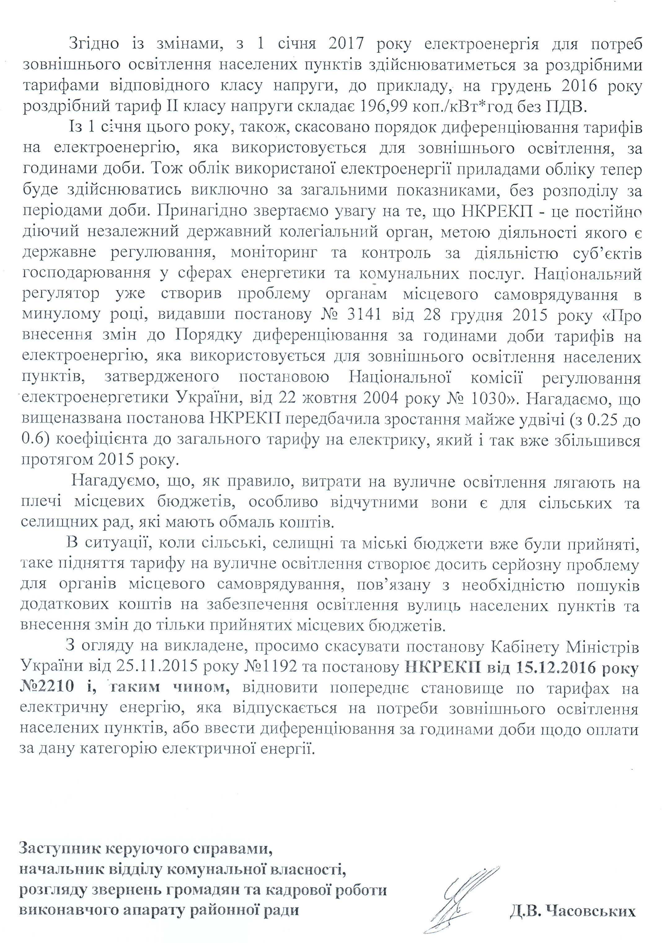 Головна > Верховна Рада України > Вхідна документація > Лист Вінницької районної ради щодо підтримки звернення депутатів Глибоцької районної ради стосовно недопущення підвищення тарифів на електроенергію