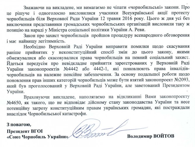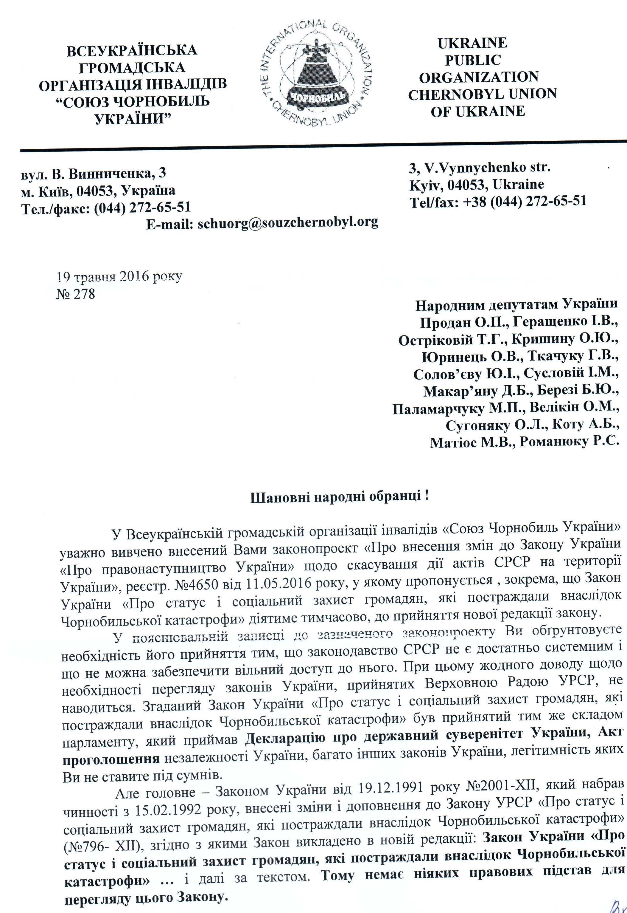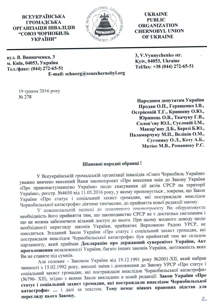 13Чер Коментування вимкнено Лист Всеукраїнської громадської організації інвалідів “Союз Чорнобиль України” щодо законопроектів у сфері соціального захисту чорнобильців ВІДПОВІДЬ НА ЛИСТ