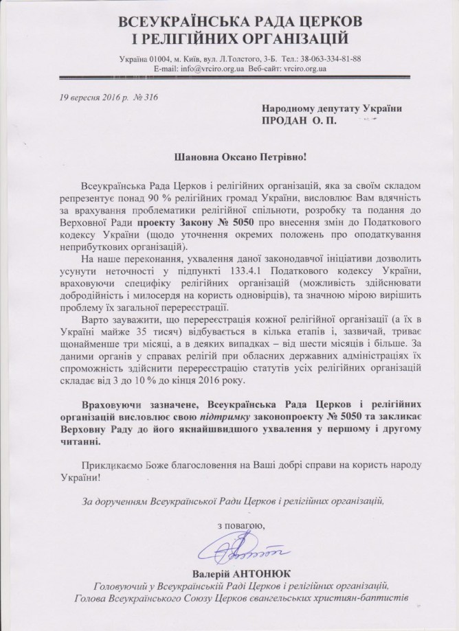 Головна > Верховна Рада України > Вхідна документація > Лист Всеукраїнської ради церков і релігійних організацій щодо підтримки законопроекту “Про внесення змін до Податкового кодексу України” (щодо уточнення окремих положень про оподаткування неприбуткових організацій), реєстр. №5050