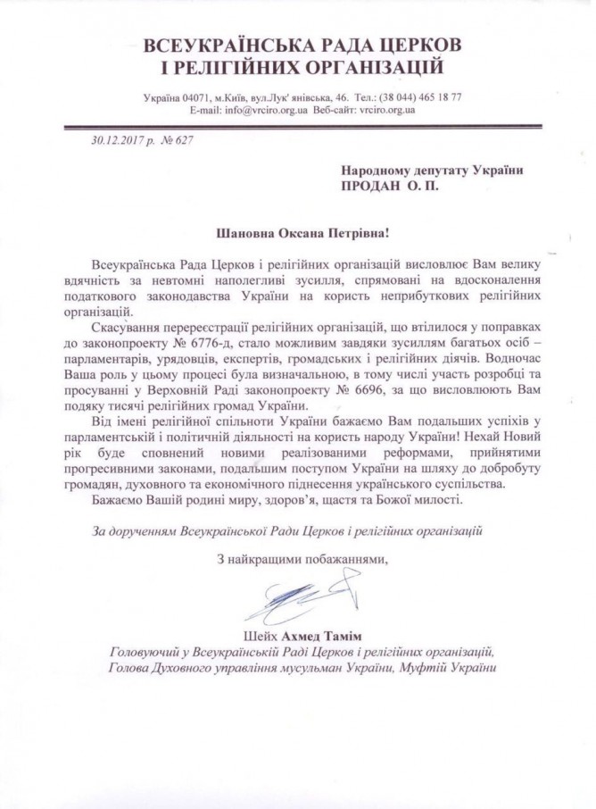 09Січ Коментування вимкнено Лист Всеукраїнської ради церков і релігійних організацій з подякою за вдосконалення податкового законодавства в частині неприбуткового статусу релігійних організацій
