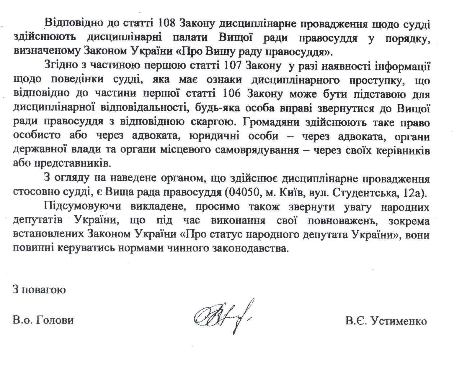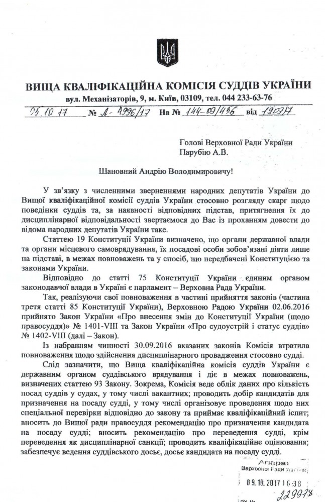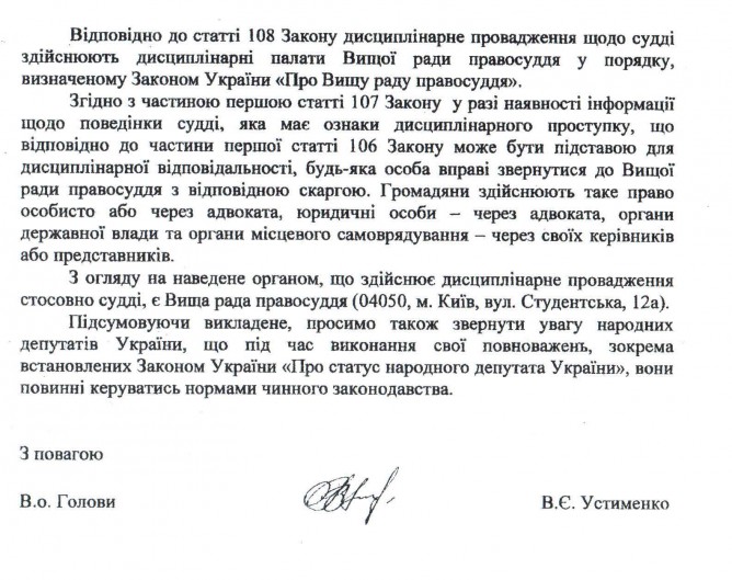 Лист Вищої кваліфікаційної комісії суддів України щодо розгляду дисциплінарних скарг на поведінку суддів