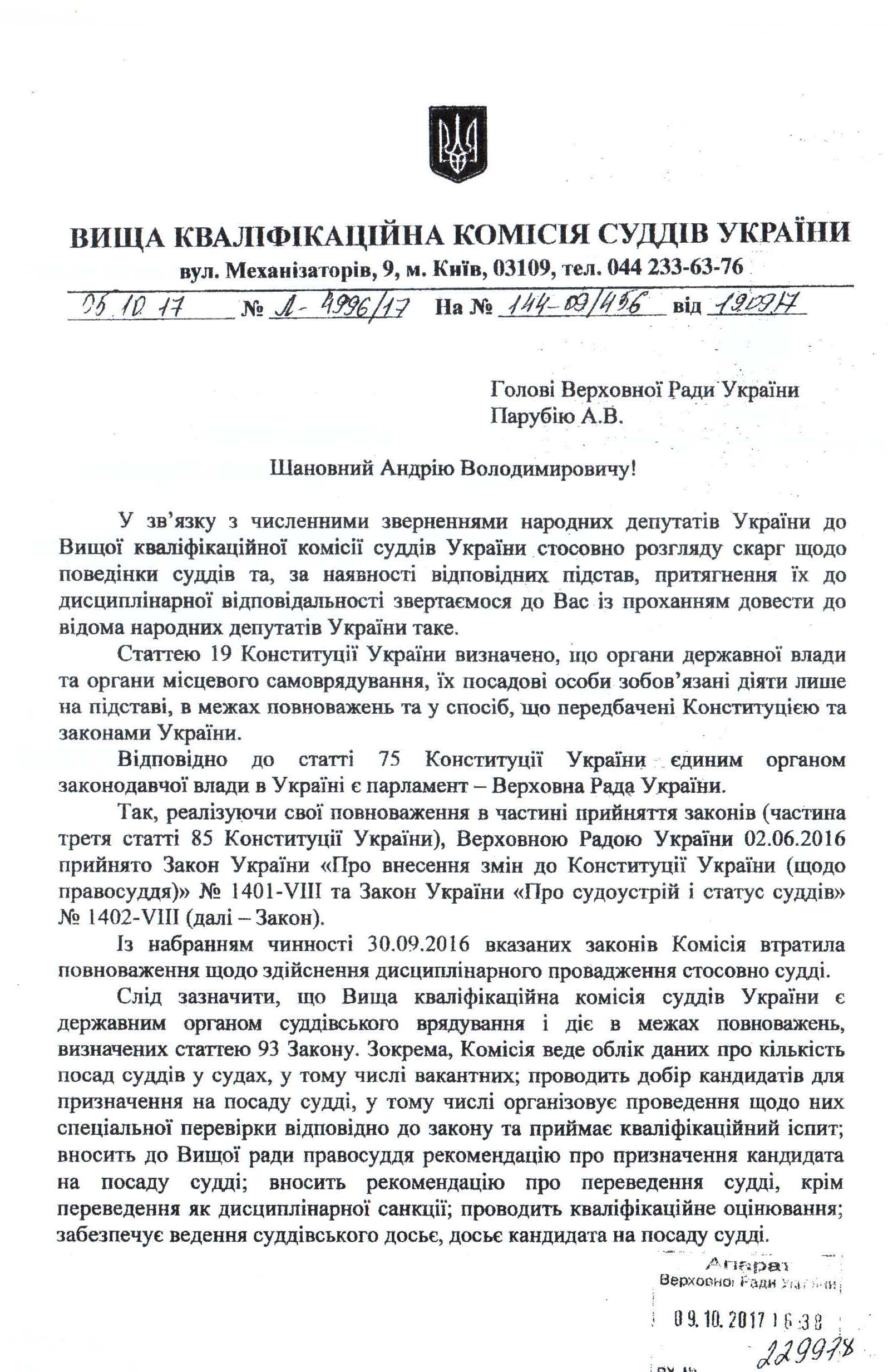 Головна > Верховна Рада України > Вхідна документація > Лист Вищої кваліфікаційної комісії суддів України щодо розгляду дисциплінарних скарг на поведінку суддів