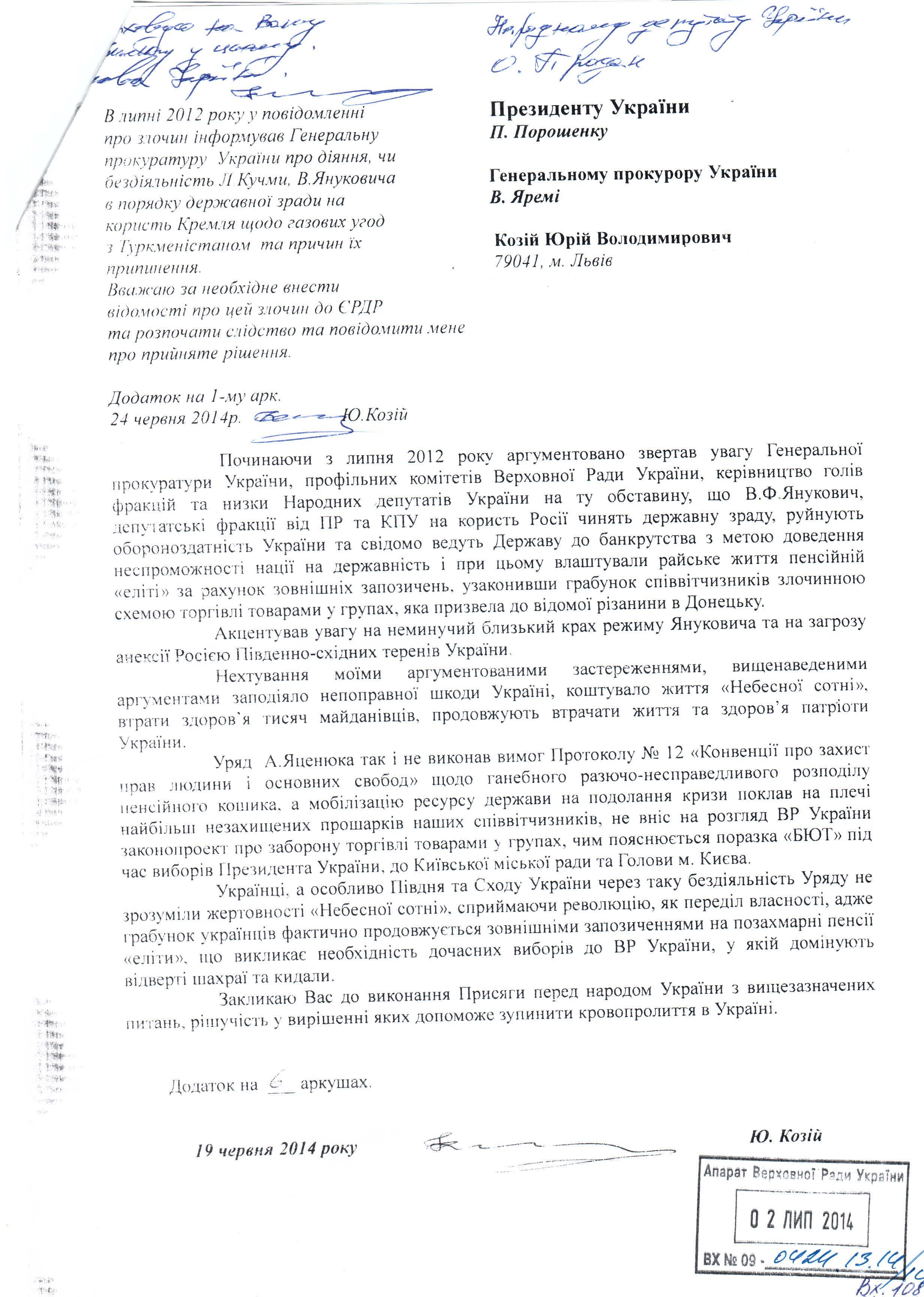 Лист Ю.Козія щодо несправедливого пенсійного забезпечення