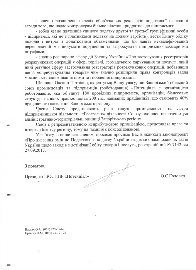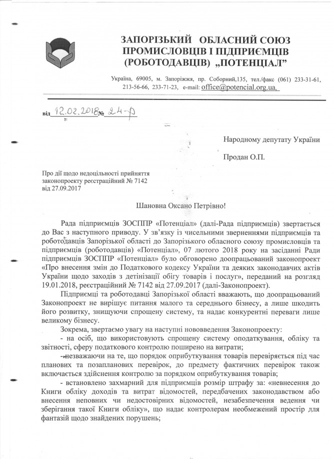 Вхідна документація > Лист Запорізького обласного союзу промисловців і підприємців (роботодавців) “Потенціал” щодо відкликання законопроекту «Про внесення змін до Податкового кодексу України та деяких законодавчих актів України щодо заходів з детінізації обігу товарів і послуг», реєстр. №7142